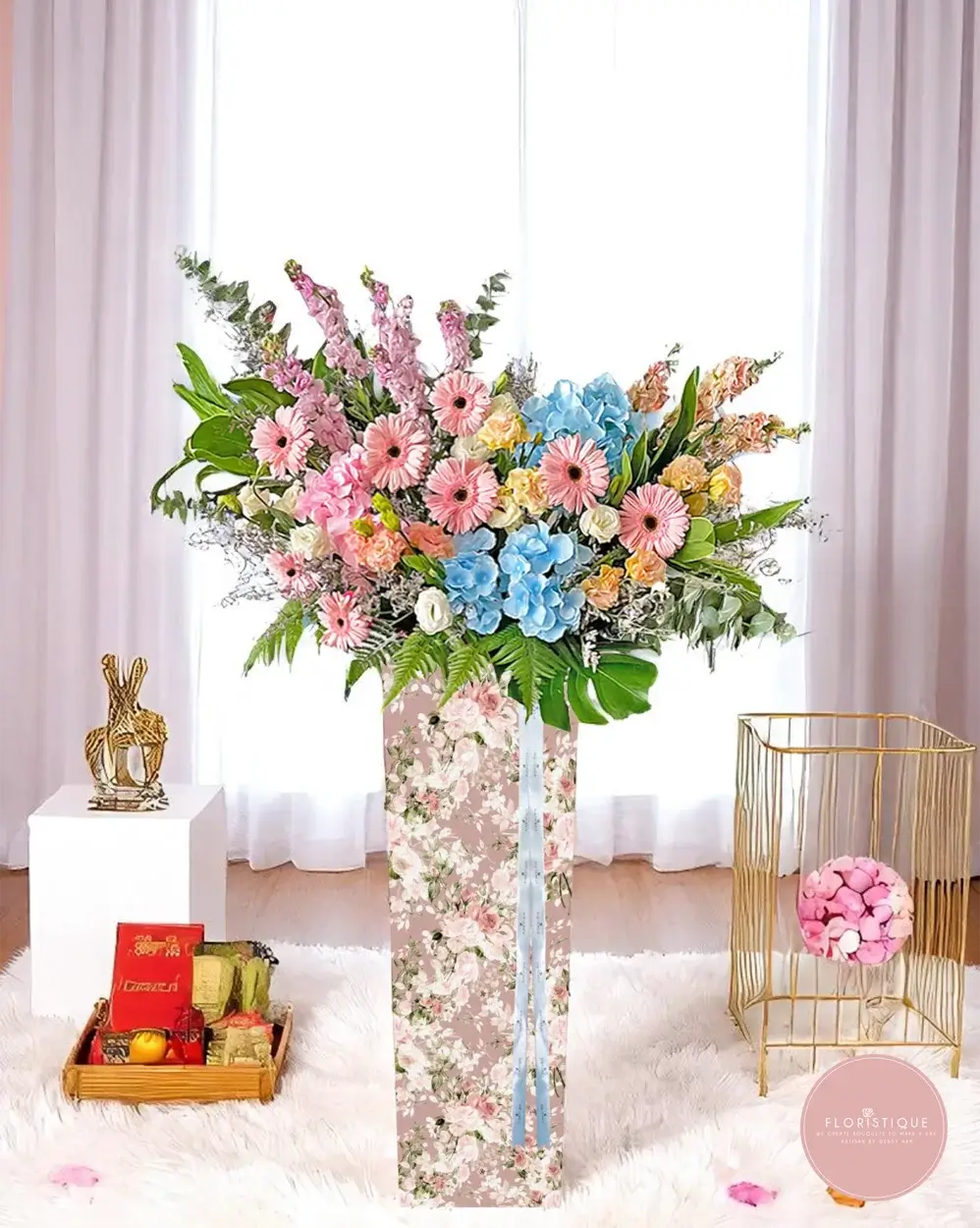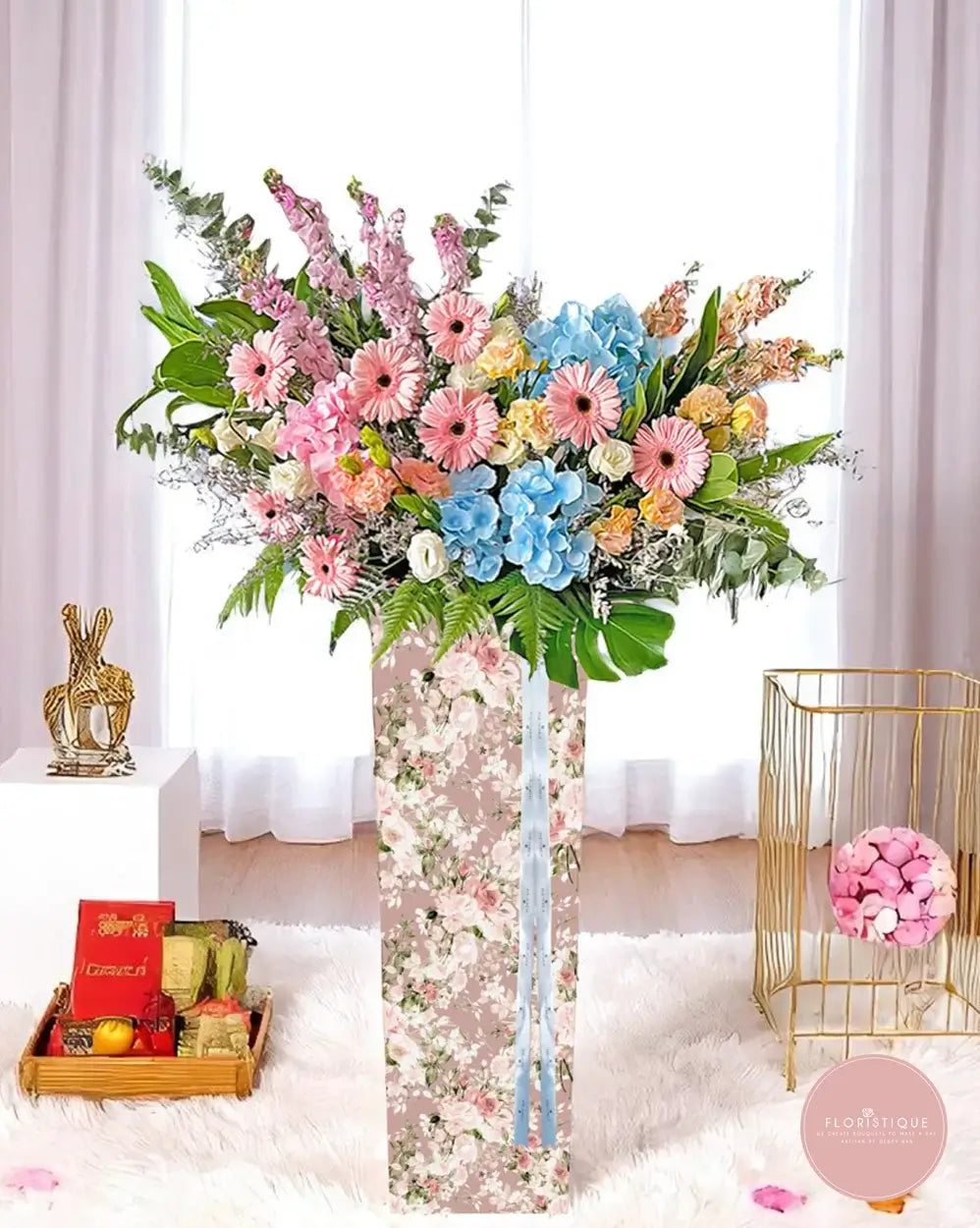 Soft, elegant, and full of charm, this pastel-themed grand opening stand is a vision of refined celebration. A delicate blend of pink gerberas, blue hydrangeas, champagne roses, and snapdragons is artfully arranged atop a romantic floral-patterned stand—perfect for boutiques, salons, or creative studios seeking a stylish and sophisticated welcome.