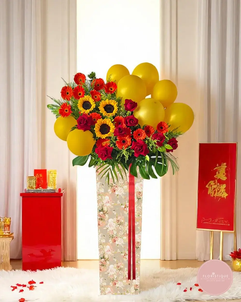 Elevate grand openings with the Golden Jubilee Stand—a vibrant celebration of success, love, and prosperity. This striking arrangement features a jubilant blend of orange gerberas, red roses, and bright sunflowers, artfully paired with golden balloons for a festive touch. Designed to turn heads and mark milestones, this sunflower and red rose flower stand sets the perfect tone for any business launch or celebratory occasion.