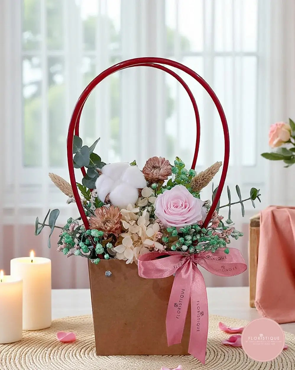 A sweet and timeless preserved floral arrangement designed to last beautifully for months. Featuring a soft blush pink preserved rose paired with fluffy cotton blooms, beige hydrangea, rustic wheat stalks, and dainty green-tinted baby’s breath, all accented with sprigs of eucalyptus. Presented in a kraft bag with rich red handles and tied with a matching pink satin ribbon, it’s the perfect blend of elegance and charm.