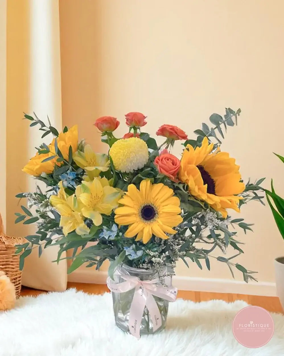 A burst of sunshine in a jar, this vibrant vase arrangement features golden sunflowers, bright yellow gerberas, coral spray roses, and cheerful alstroemeria. Accented with eucalyptus and seasonal fillers, it brings an energizing touch to any room or celebration.