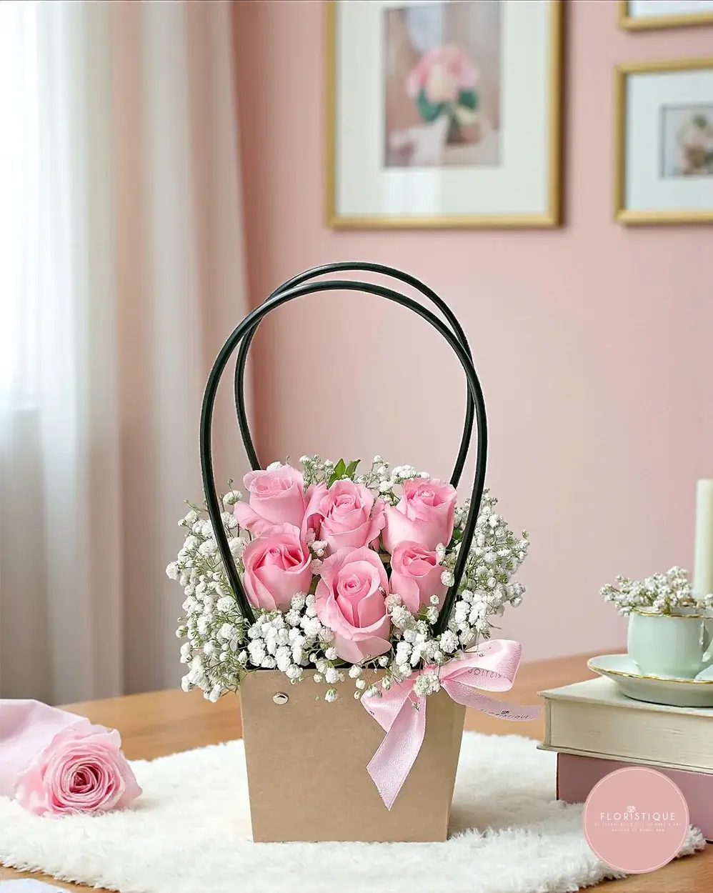 Delightfully charming, this floral bag features fresh pink roses surrounded by delicate baby’s breath, creating a sweet and graceful arrangement. Its elegant design makes it a wonderful choice for birthdays, anniversaries, or simply to brighten someone’s day with beauty and love.