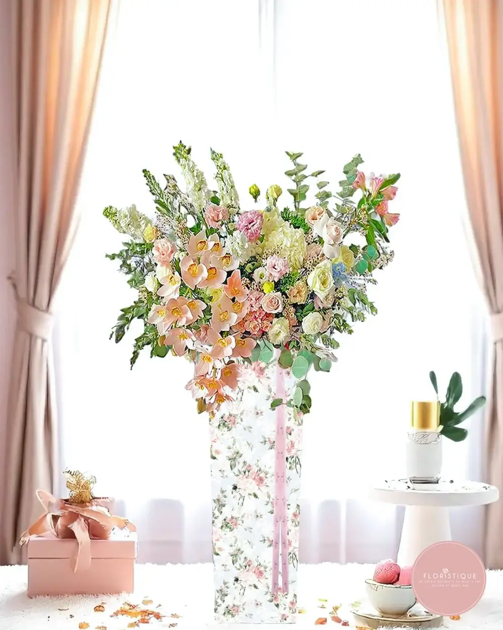 Graceful and dreamy, this grand opening flower stand features a soft medley of peach-toned roses, delicate snapdragons, and lush eucalyptus, arranged in a romantic floral-patterned stand. The subtle colour palette exudes serenity and sophistication, perfect for welcoming new beginnings with gentle charm.
