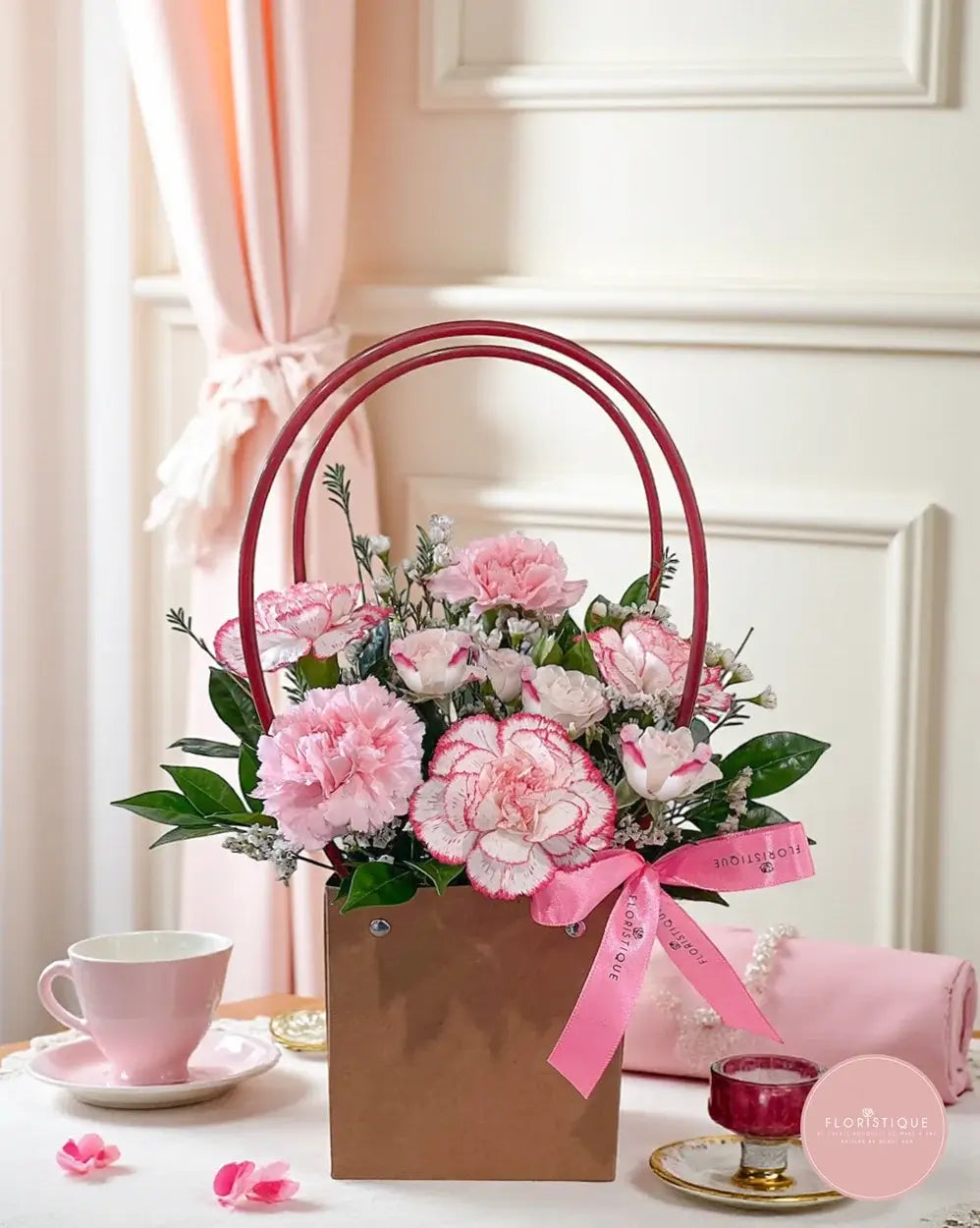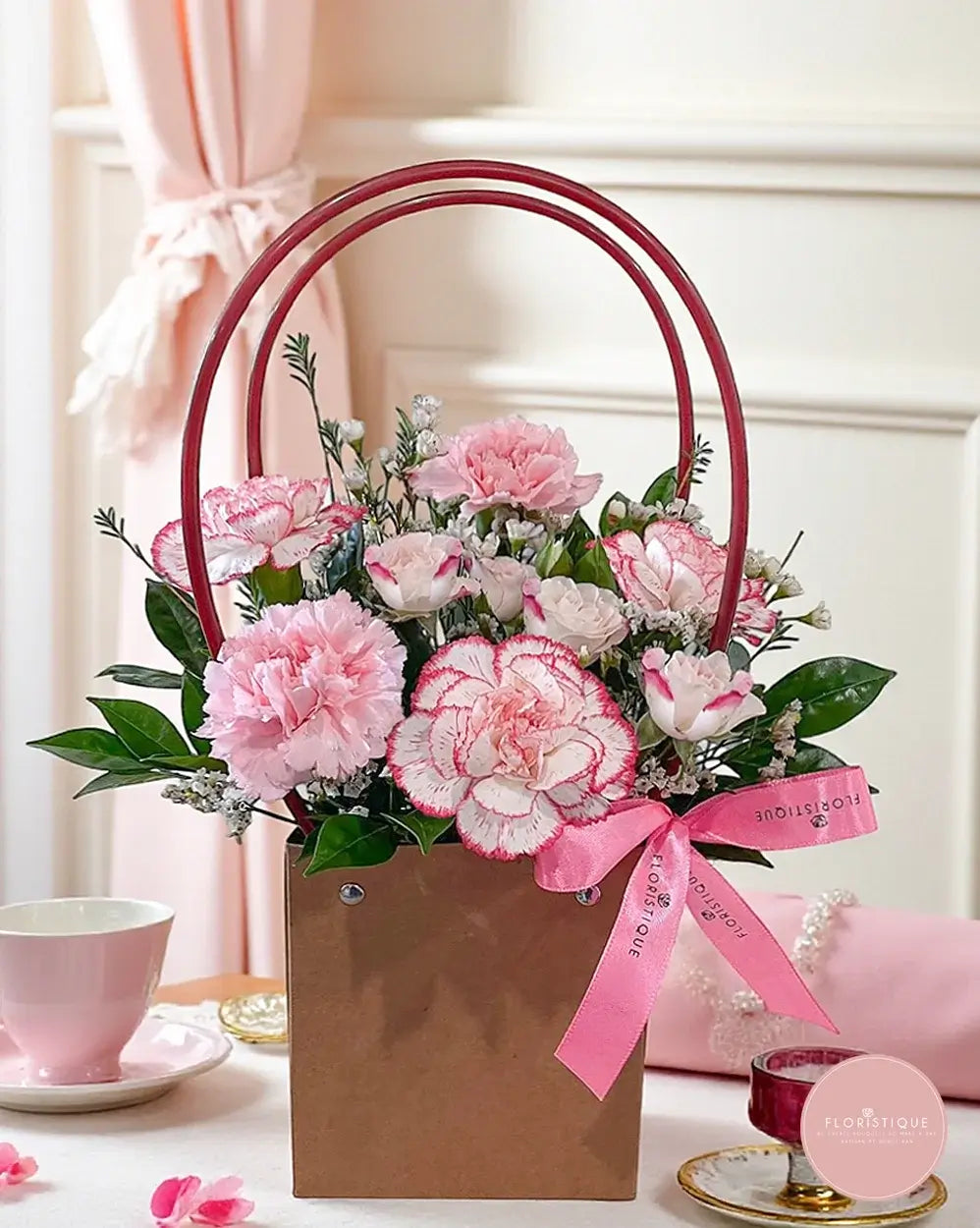 This graceful floral bag showcases soft pink carnations accented with lush greenery and dainty fillers, creating a sweet and timeless arrangement. Its pastel hues and modern bag design make it a thoughtful gift for birthdays, anniversaries, or simply to brighten someone’s day. Perfectly sized for any setting, it adds a touch of elegance and charm.