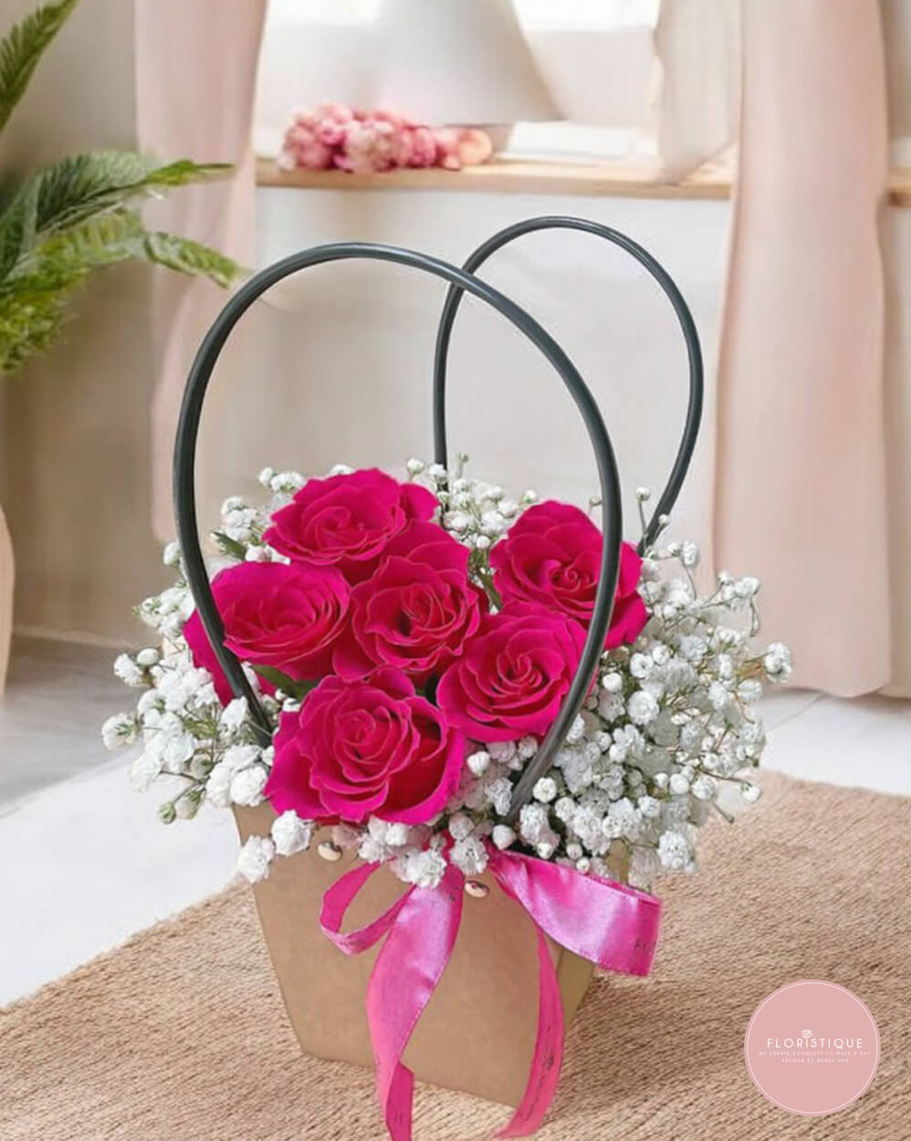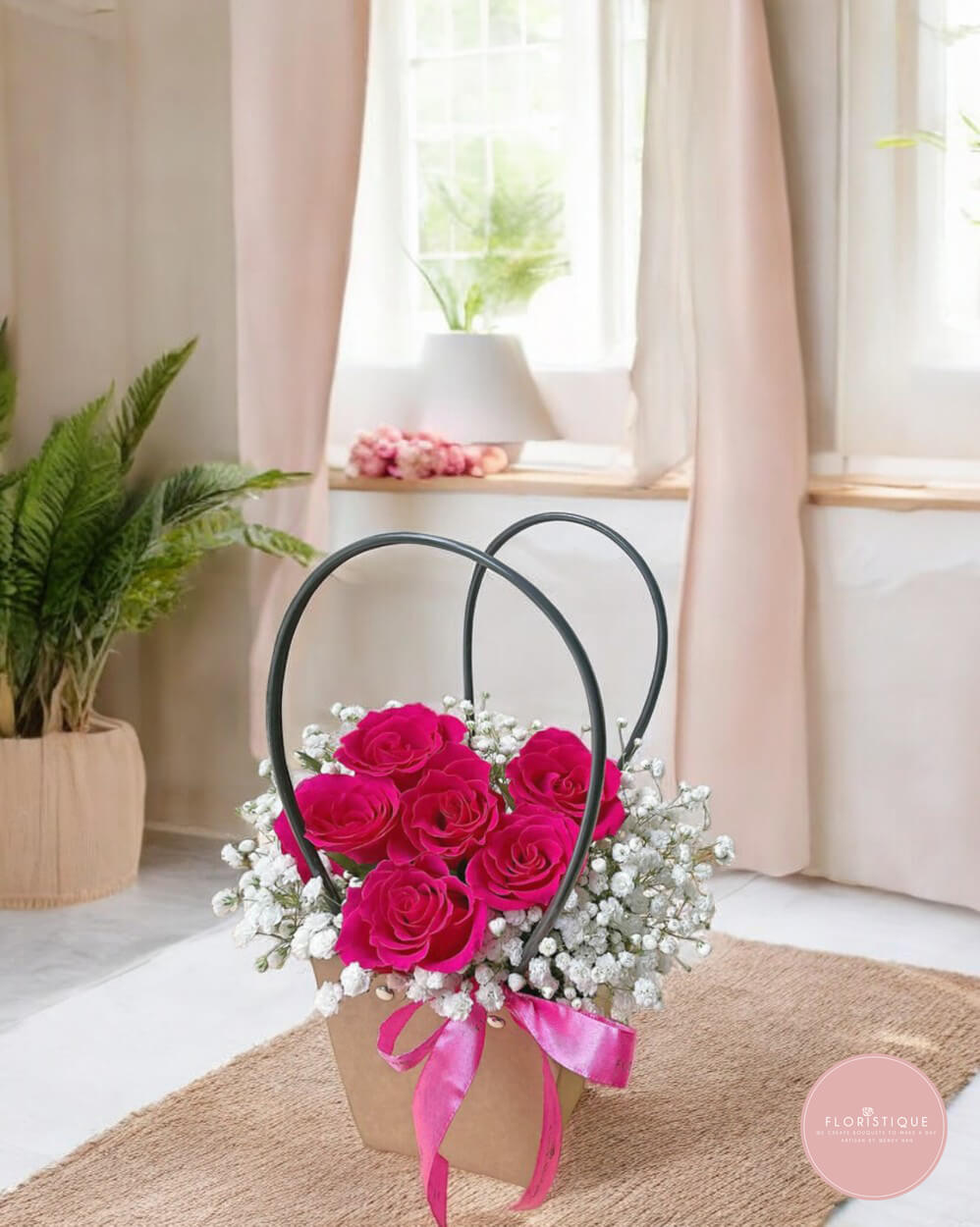 This charming floral basket features a cluster of vibrant pink roses beautifully framed within a heart-shaped handle, accented with soft white baby’s breath for a light and romantic finish. Tied with a delicate pink ribbon and presented in a kraft basket, the arrangement expresses love, affection, and heartfelt sincerity. A thoughtful choice for anniversaries, Valentine’s Day, birthdays, or simply to let someone know they hold a special place in your heart.