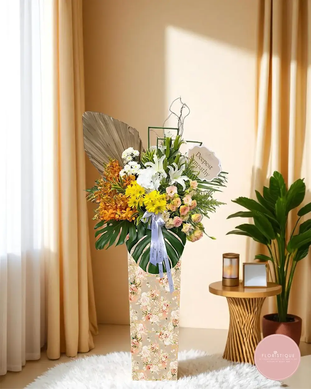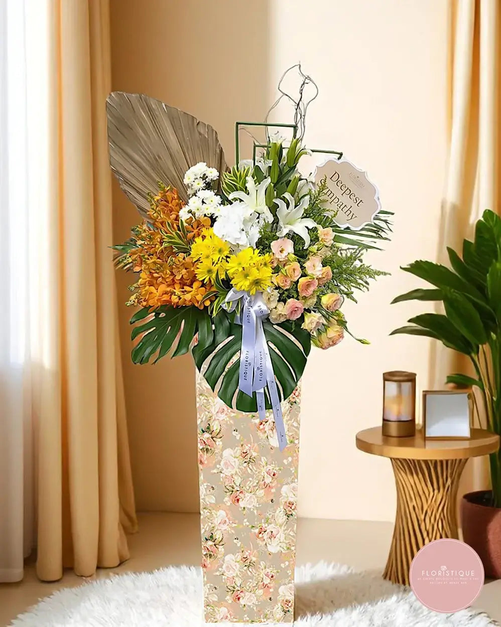 This elegant condolence stand features a serene combination of white lilies, golden yellow chrysanthemums, soft champagne roses, and warm orange orchids, accented with tropical foliage and a structured dried palm leaf. A dignified expression of comfort and remembrance, perfect for honoring a loved one’s memory.
