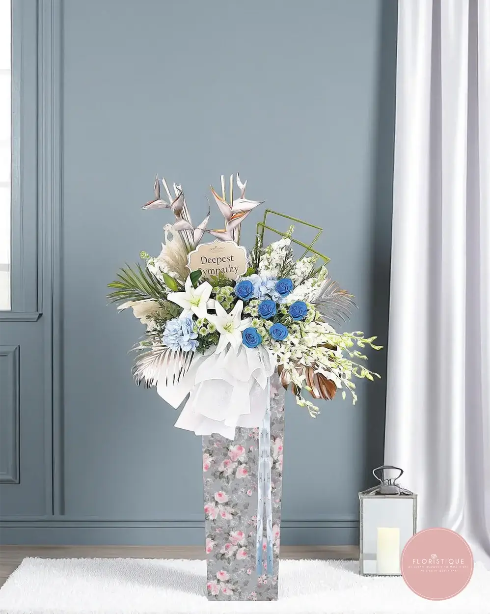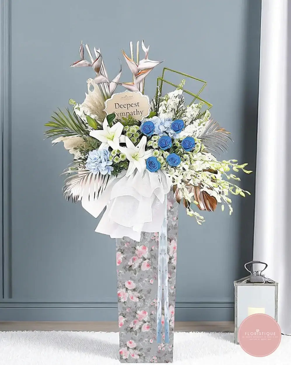 Convey your deepest condolences with this refined condolence stand, showcasing serene white lilies, striking blue roses, soft baby’s breath, and exotic silver-toned birds of paradise. Arranged with textured foliage and soft accents, it offers a dignified and peaceful tribute to a cherished soul.
