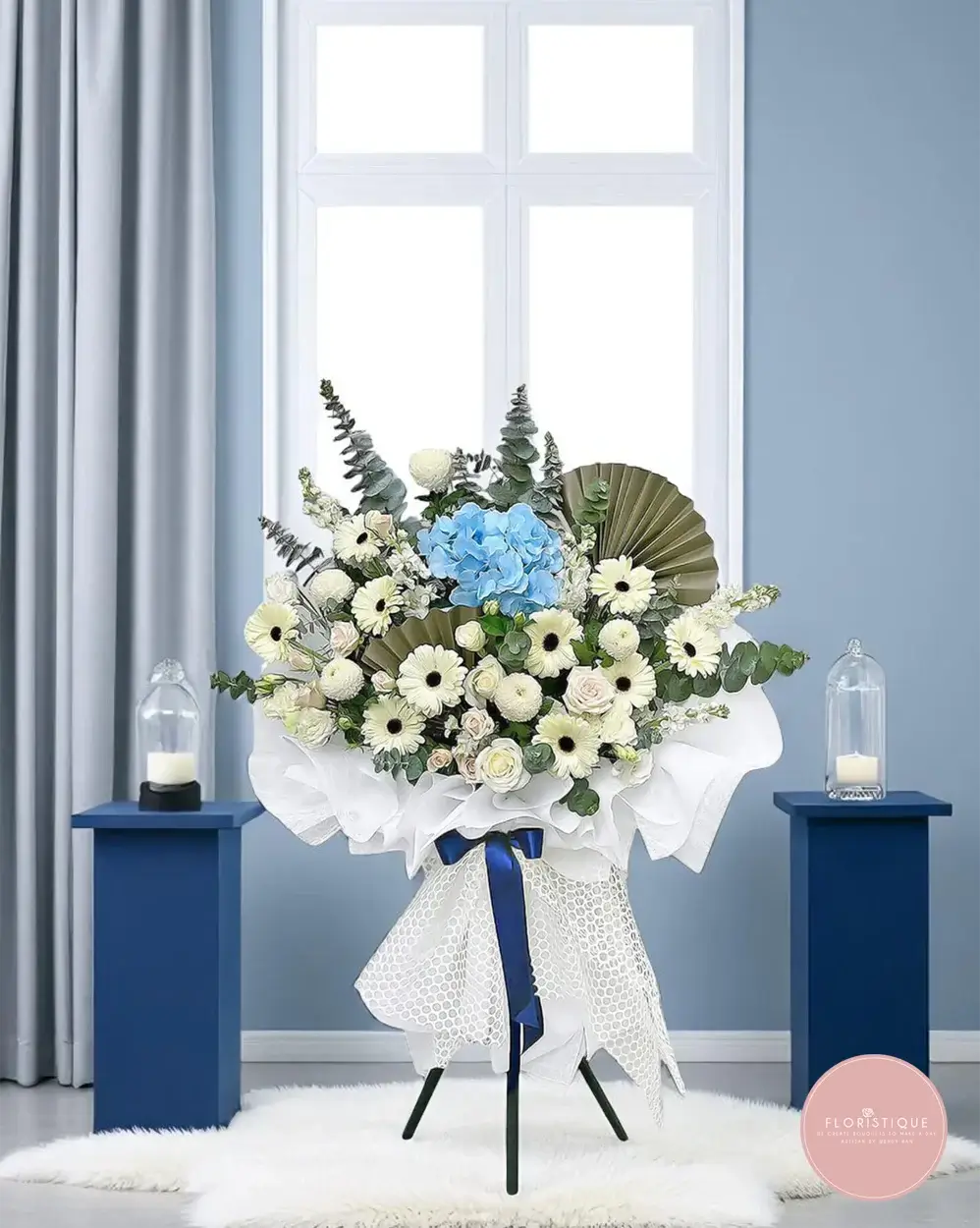 This serene condolence stand features calming blue hydrangeas surrounded by soft white gerberas, roses, and elegant foliage. The refined palette offers a message of peace and remembrance, making it a dignified tribute to a life well lived.