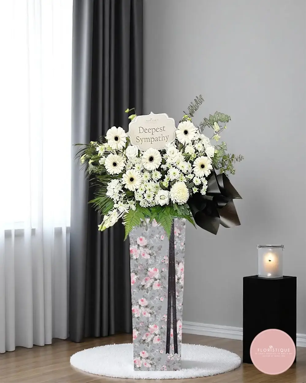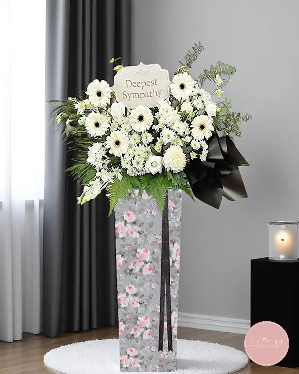 A heartfelt arrangement of pure white gerberas and chrysanthemums, gracefully accented with lush greenery and solemn black ribbons. This condolence flower stand embodies quiet strength and peaceful remembrance, offering comfort and support in moments of sorrow.