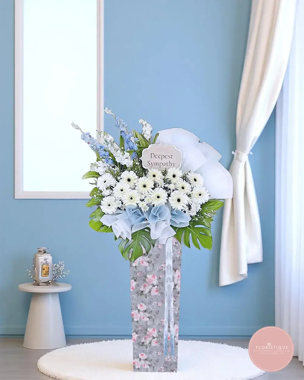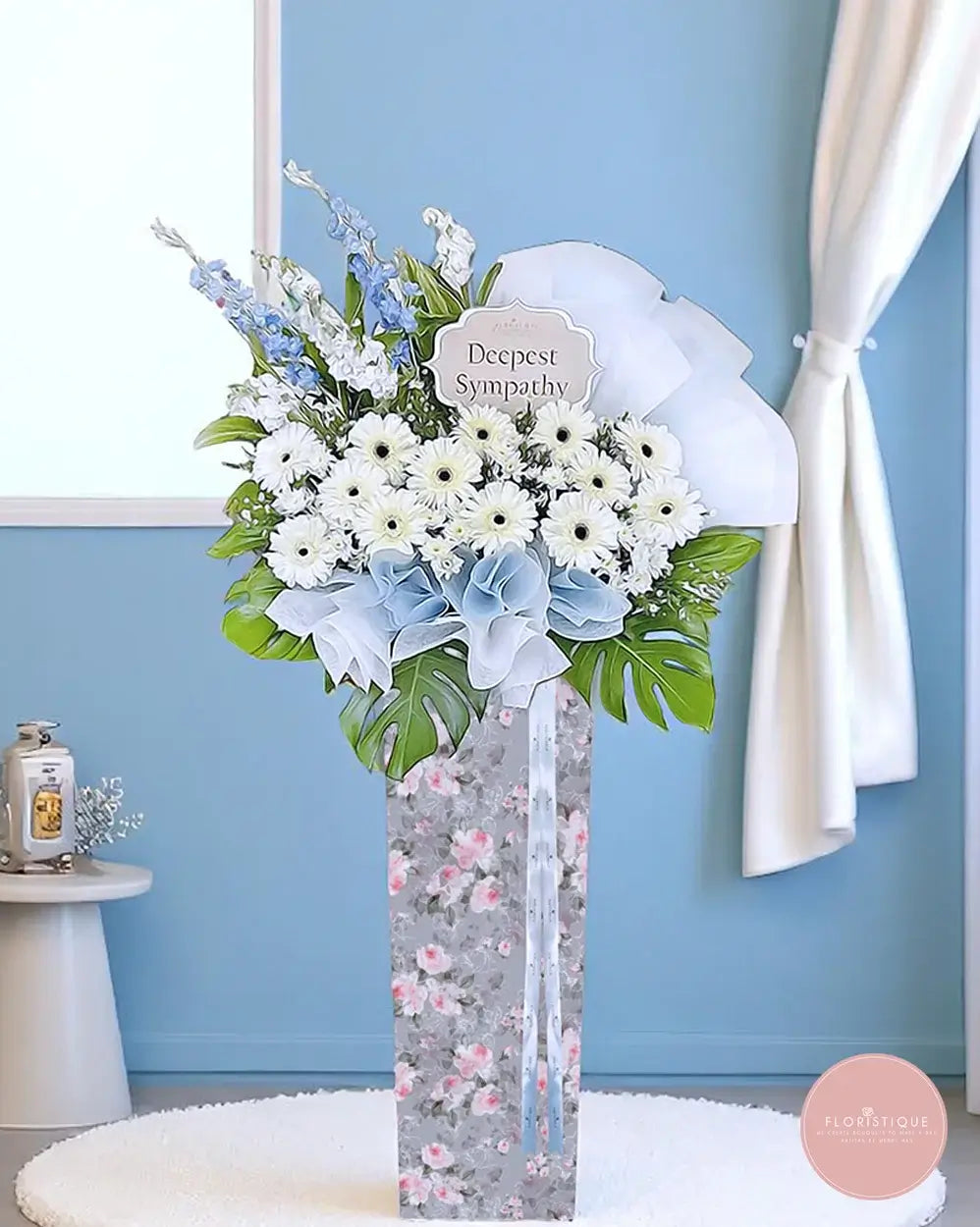 A serene arrangement of soft white gerberas and baby blue fillers, gently embraced by fresh greens and elegant wrapping. This condolence stand radiates peace and heartfelt sympathy, offering comfort in a graceful and respectful presentation.