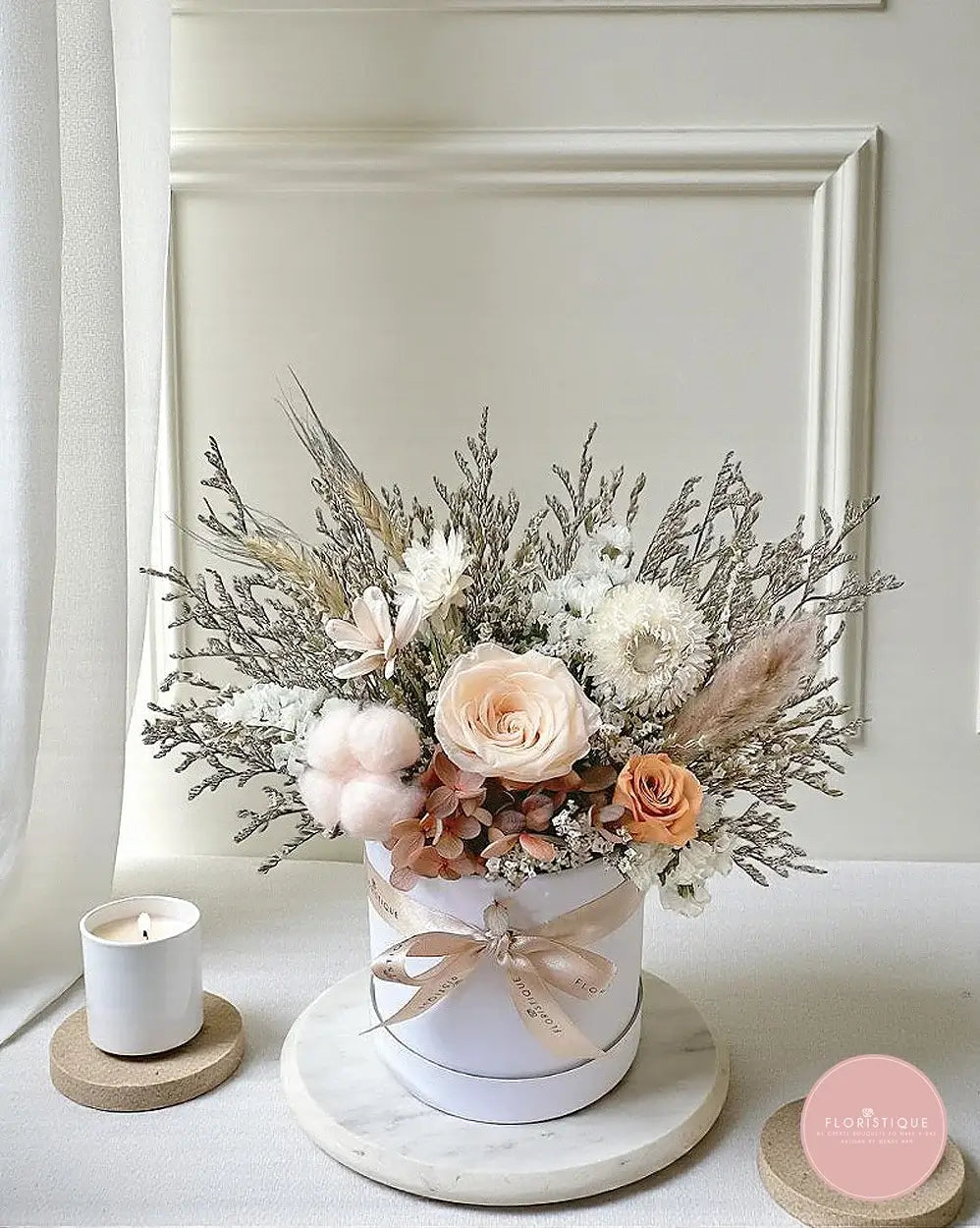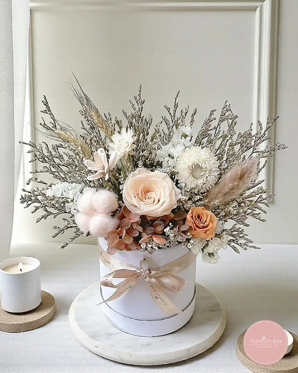 Soft champagne and peach tones come together in a chic round box—featuring preserved roses, hydrangea, strawflower, bunny tails, airy fillers and fluffy cotton for a cosy, neutral look. Handcrafted by our online florist in Singapore, this long-lasting preserved flower arrangement needs no watering; simply keep it cool and dry for months of effortless beauty. It’s a thoughtful choice for birthdays, anniversaries, housewarmings or a sweet “thinking of you.”