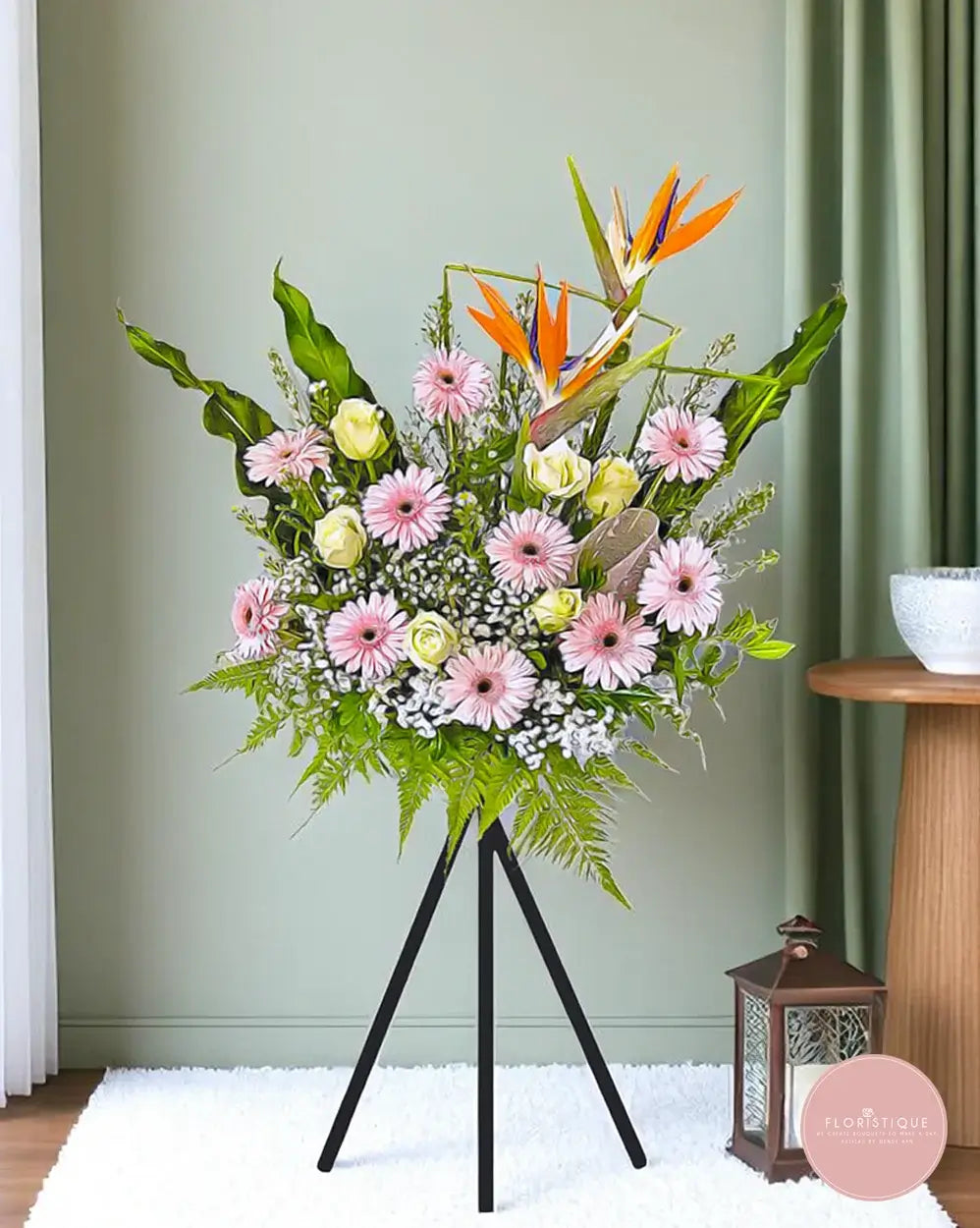 This elegant condolence flower stand features soft blush gerberas and cream roses, delicately accented with birds of paradise and lush greenery. A refined arrangement that speaks volumes of love and remembrance, offering comfort in times of sorrow.