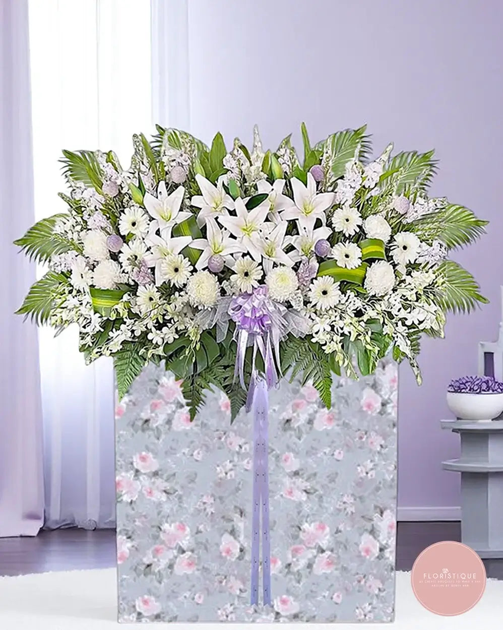 A serene tribute featuring pure white lilies, chrysanthemums, and soft lilac accents, this arrangement conveys heartfelt condolences with grace and dignity. Set against a lush backdrop of greenery, it's a comforting presence during times of loss.