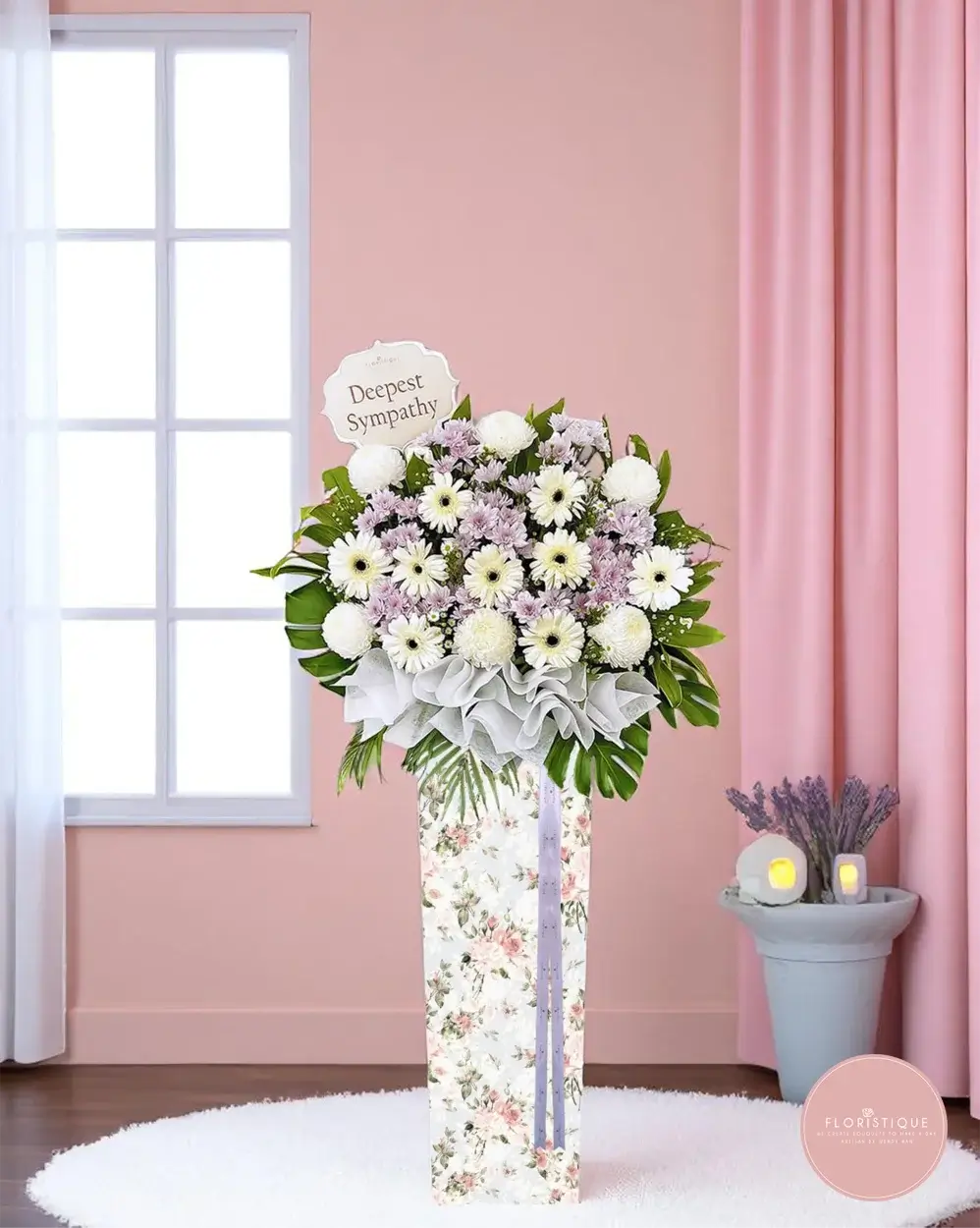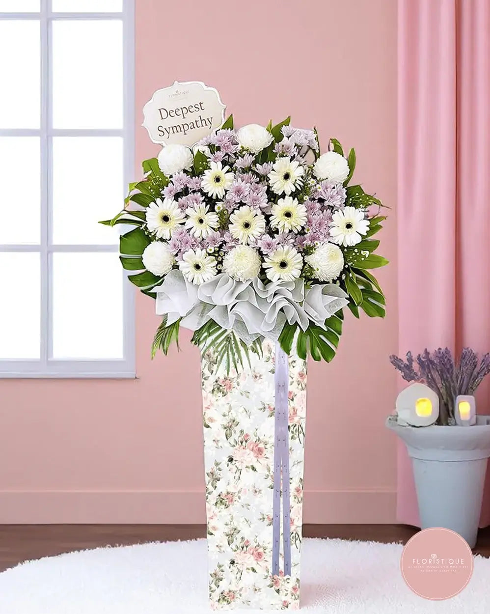 This graceful condolence stand features soft white gerberas and chrysanthemums accented with pale lavender blooms and lush greenery. Elegantly arranged to offer comfort and convey heartfelt sympathy during times of loss.