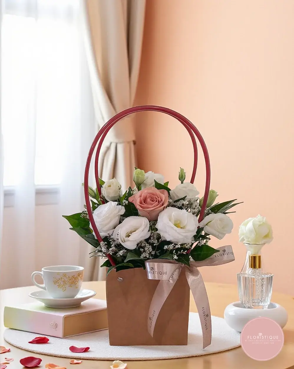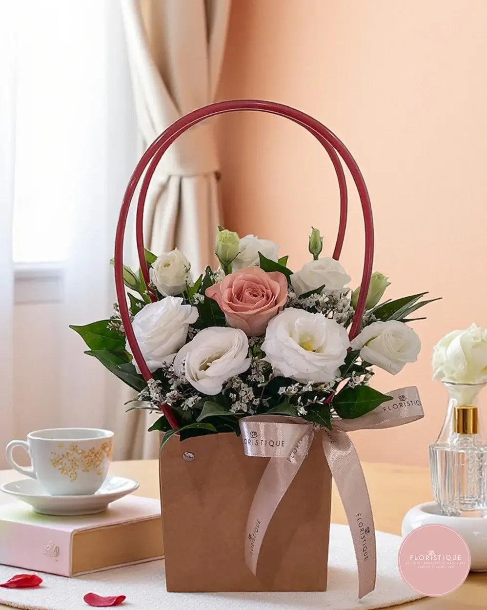 An elegant bloom bag featuring a cappuccino rose surrounded by white eustoma and accented with delicate filler flowers. Presented in a stylish kraft bag with red handles and tied with a satin ribbon, this arrangement combines simplicity with timeless charm.