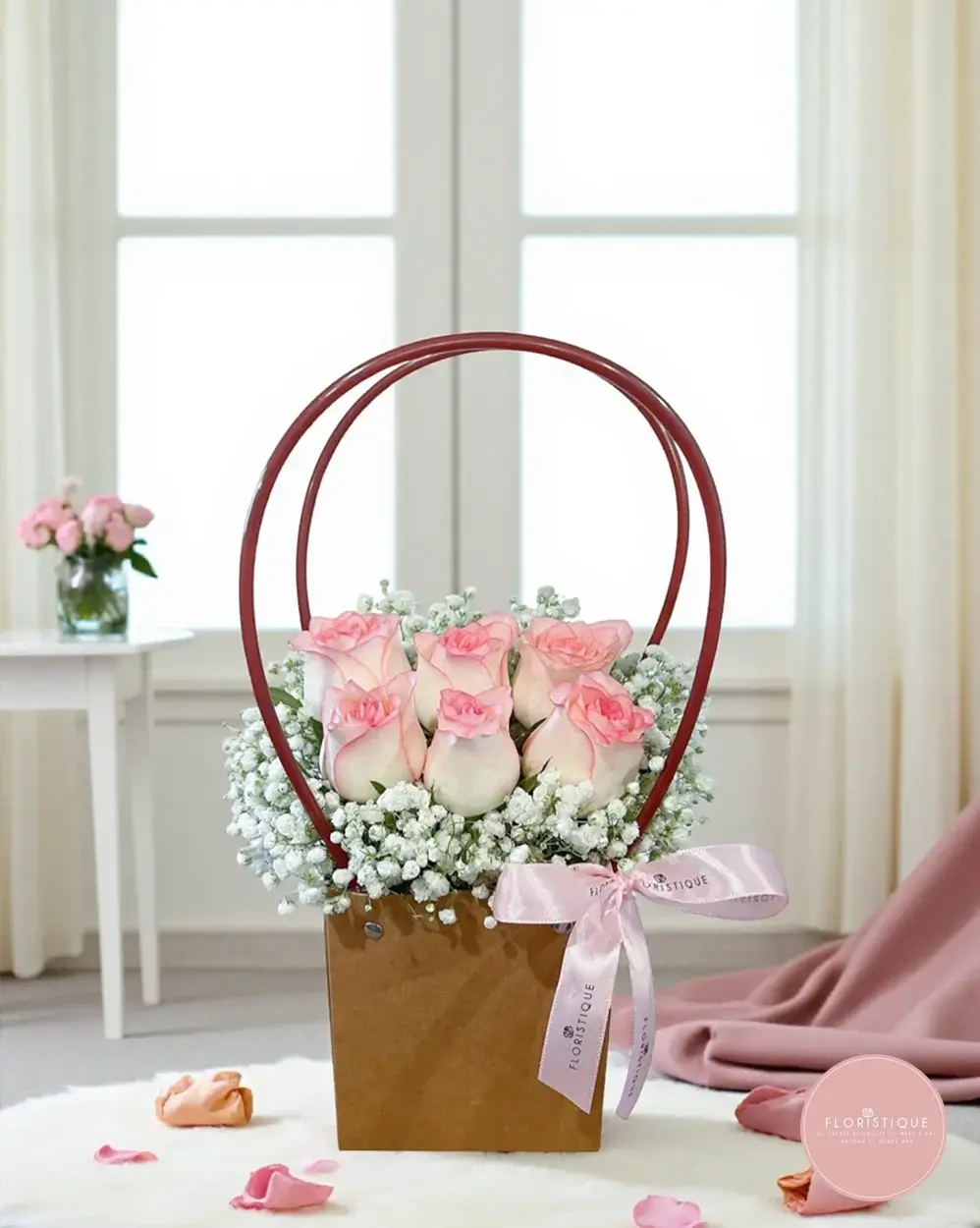 Elegant in its simplicity, this petite floral bag features six graceful blush pink roses nestled within a bed of delicate white baby’s breath. Set in a rustic kraft bag with twin red handles and finished with a satin ribbon, this design is sweet, refined, and full of charm.