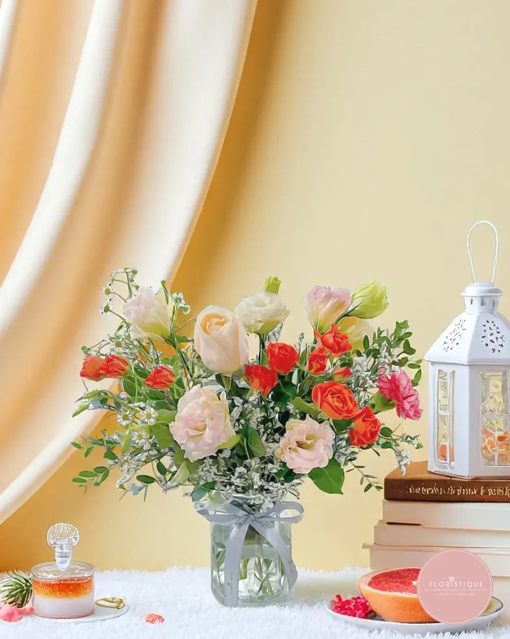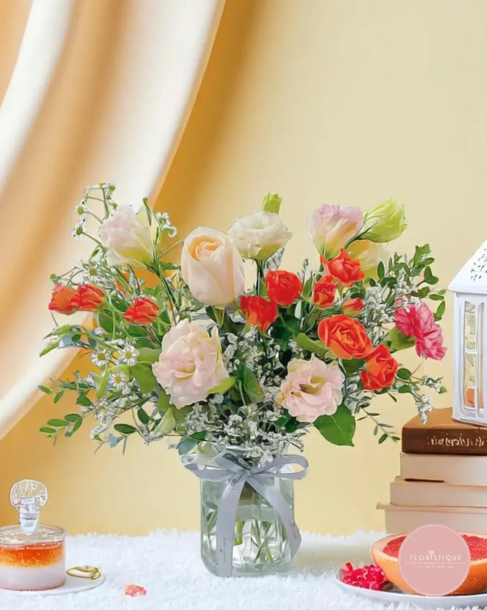 This delightful vase arrangement features a cheerful mix of peach roses, coral carnations, and creamy eustoma, accented with chamomile and sprigs of lush greenery. The soft yet lively hues bring warmth and charm—perfect for birthdays, well wishes, or brightening up any space.