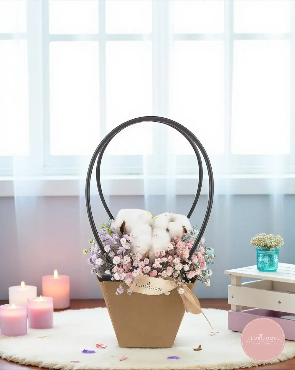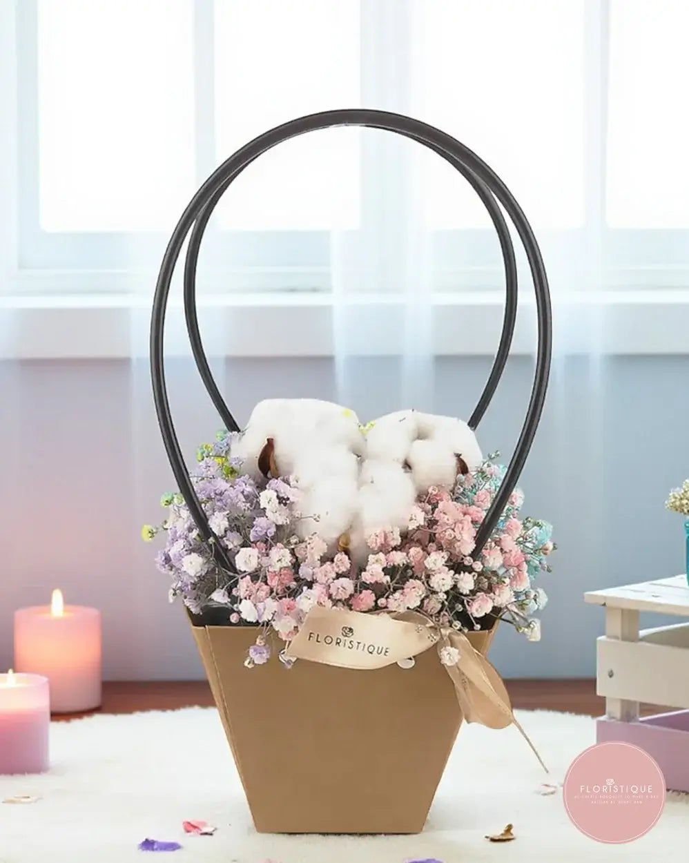 A whimsical and lasting arrangement featuring fluffy preserved cotton blooms nestled among pastel rainbow baby’s breath in shades of pink, purple, and blue. Arranged in a stylish kraft bag with sleek black handles and finished with a delicate beige ribbon, this piece offers beauty that lasts for months without any maintenance.
