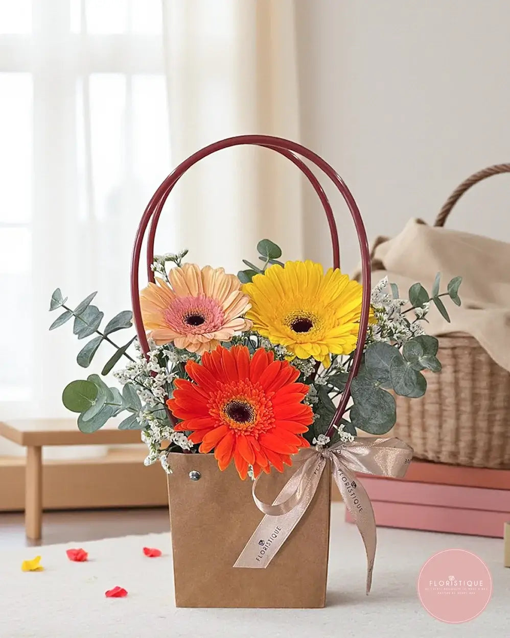 A cheerful and eye-catching floral bag featuring bold orange, sunny yellow, and soft pink gerbera daisies, accented with fresh eucalyptus and dainty fillers. Arranged in a stylish kraft bag with sleek black handles and finished with an elegant beige ribbon, this arrangement radiates happiness and warmth.