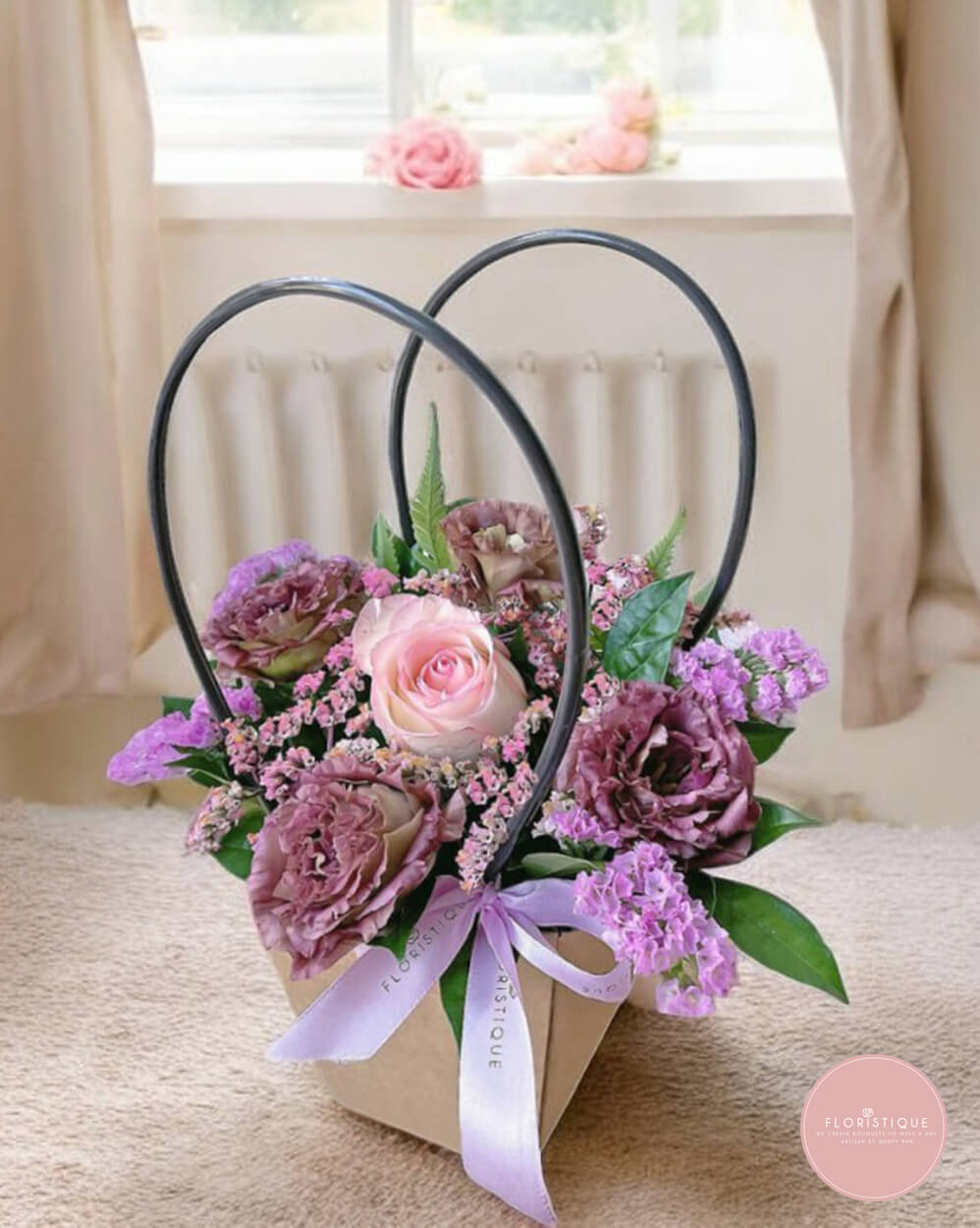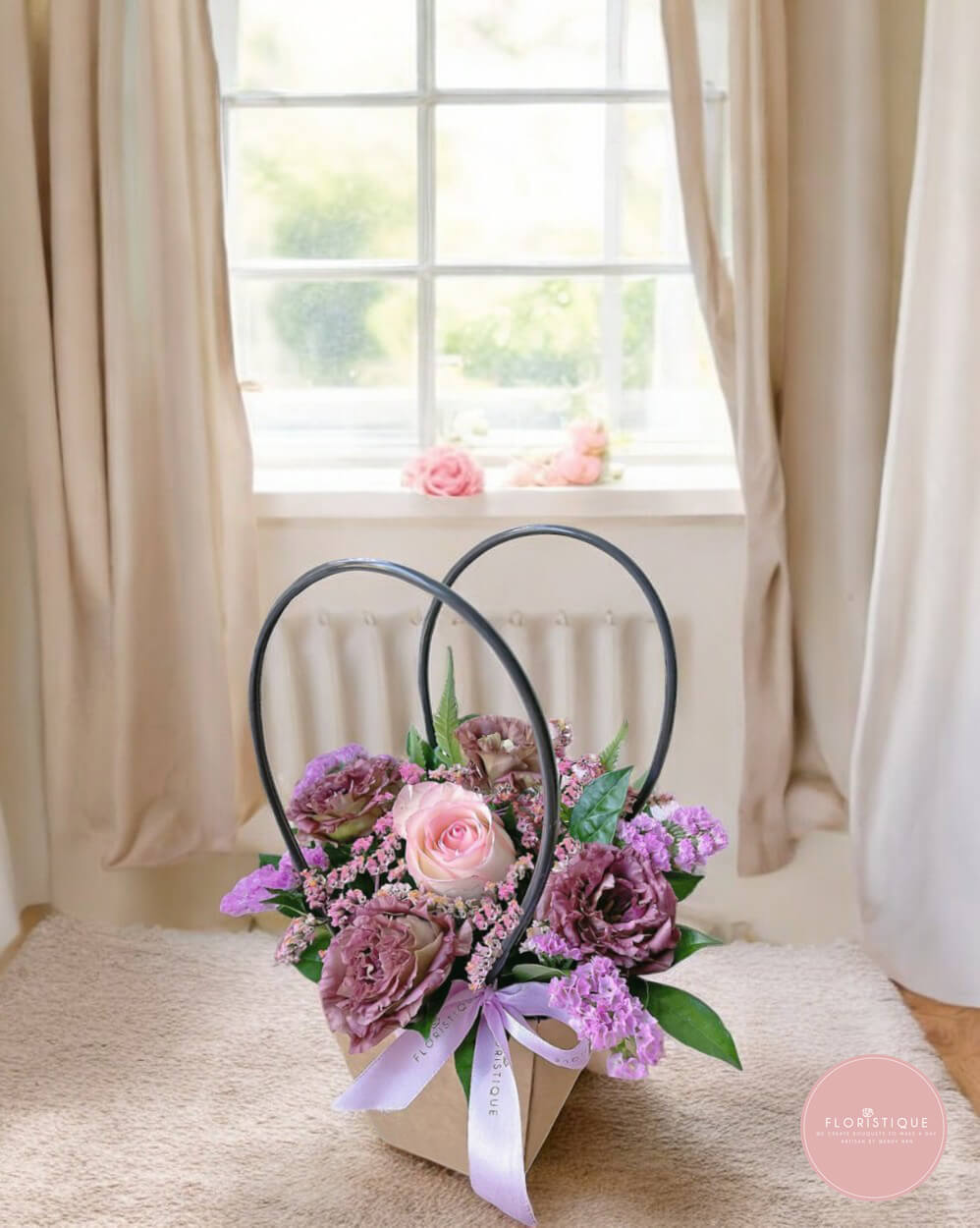 This elegant floral basket features a refined mix of dusty plum roses, soft mauve blooms, and delicate seasonal fillers, beautifully arranged beneath a heart-shaped handle that adds a romantic, sculptural touch. Finished with gentle pastel wrapping and a flowing ribbon, the design feels graceful, heartfelt, and quietly luxurious. Ideal for anniversaries, birthdays, appreciation, or when you wish to express love with understated sophistication.