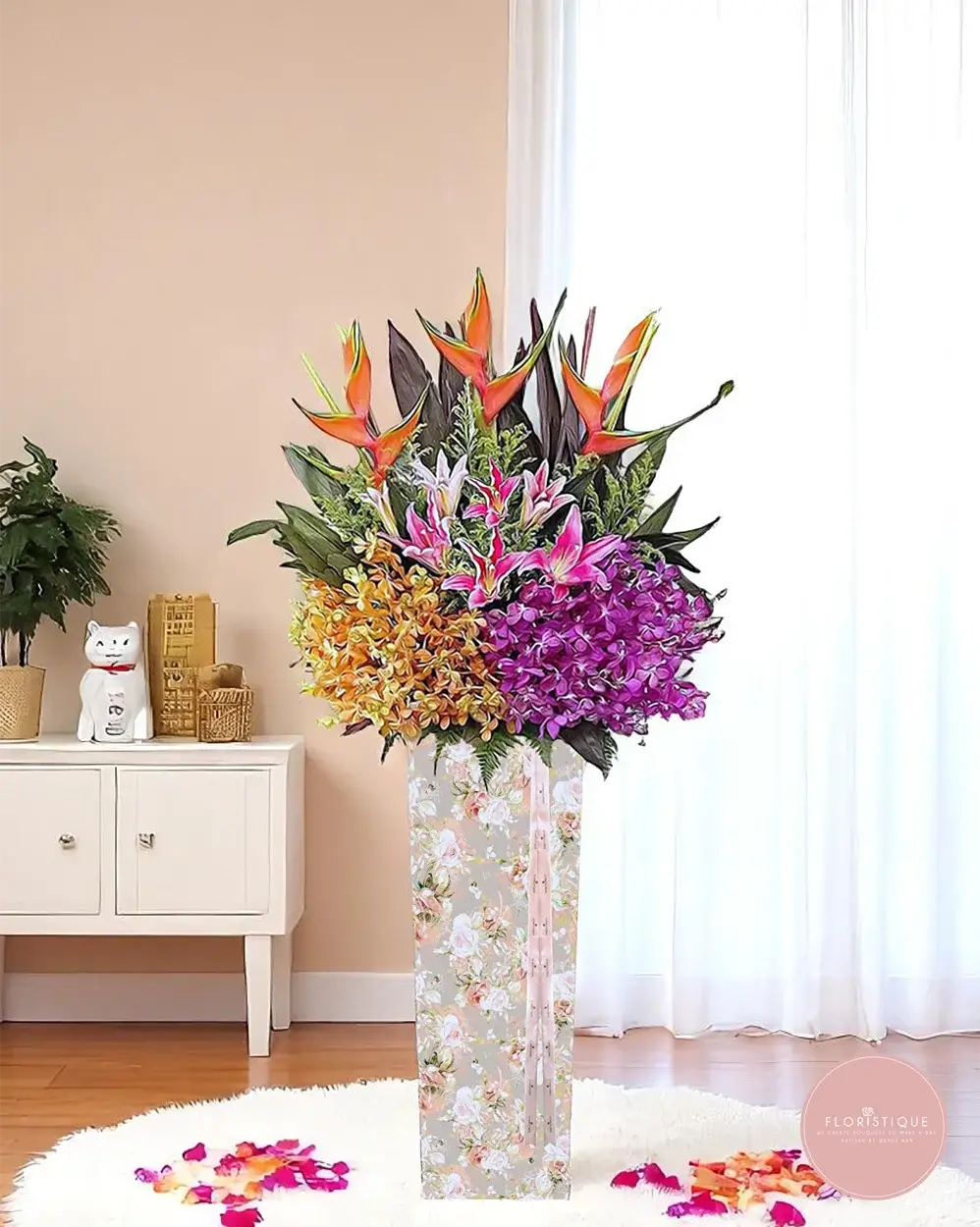 A burst of exotic beauty, this grand opening flower stand showcases vibrant birds of paradise, golden mokaras, lush purple orchids, and elegant pink stargazer lilies. Framed by rich tropical foliage and presented in a soft floral-patterned stand, this arrangement radiates prosperity, creativity, and bold celebration.