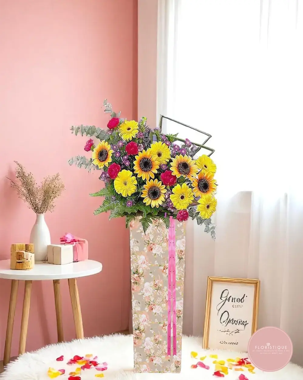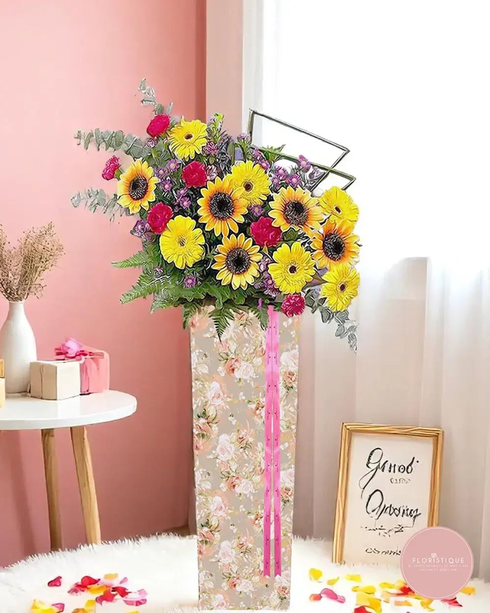 Radiant and joyful, this grand opening flower stand features a cheerful mix of bright yellow gerberas, sunflowers, red carnations, and lavender statice. Accented with fresh greenery and modern geometric decor, it’s set in a floral-patterned stand and tied with soft pink ribbon—perfect for welcoming prosperity and success.