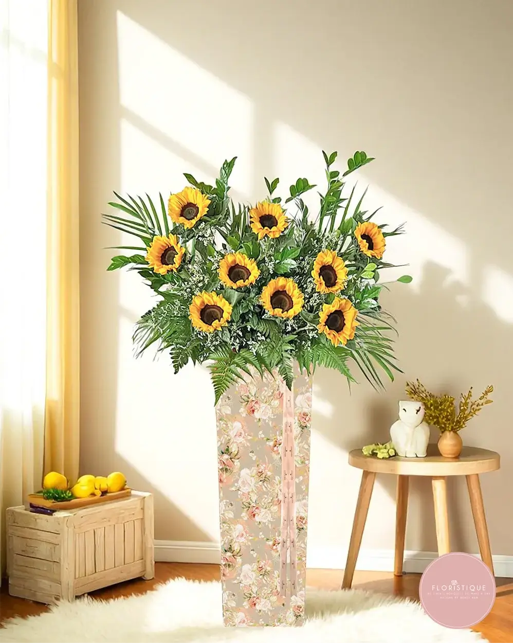 Bright and cheerful, this grand opening flower stand showcases a stunning arrangement of golden sunflowers surrounded by fresh tropical foliage and lush greens. Neatly presented in a floral-patterned stand and tied with a soft peach ribbon, it symbolizes optimism, growth, and an exciting new chapter.