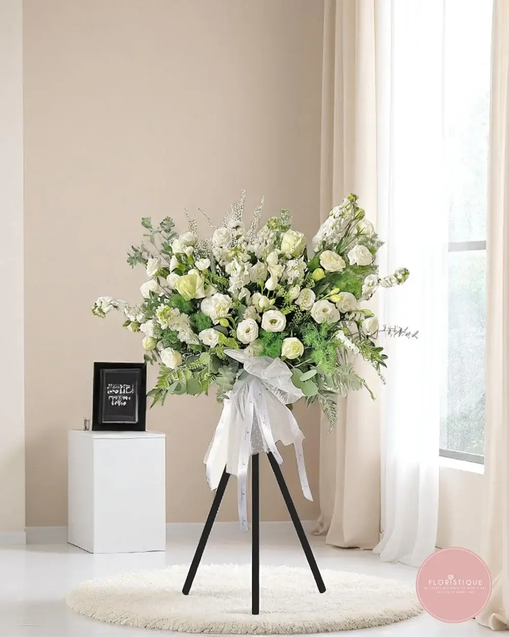 Perfect for wakes and memorials, this arrangement offers a dignified way to honour a life well lived. Enjoy free condolence flower delivery in Singapore, with islandwide same-day service available for funeral flower stands.