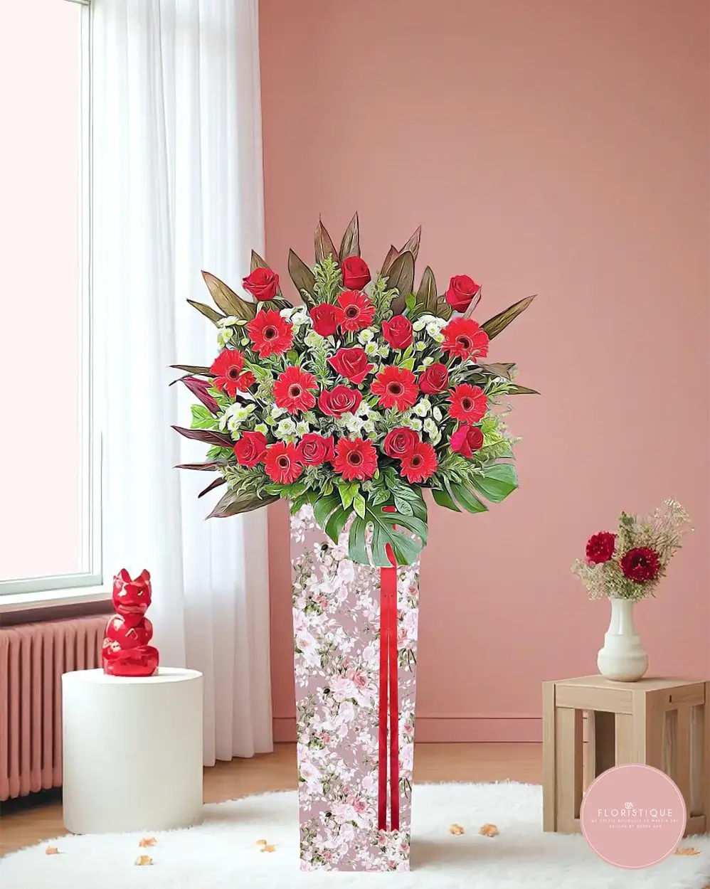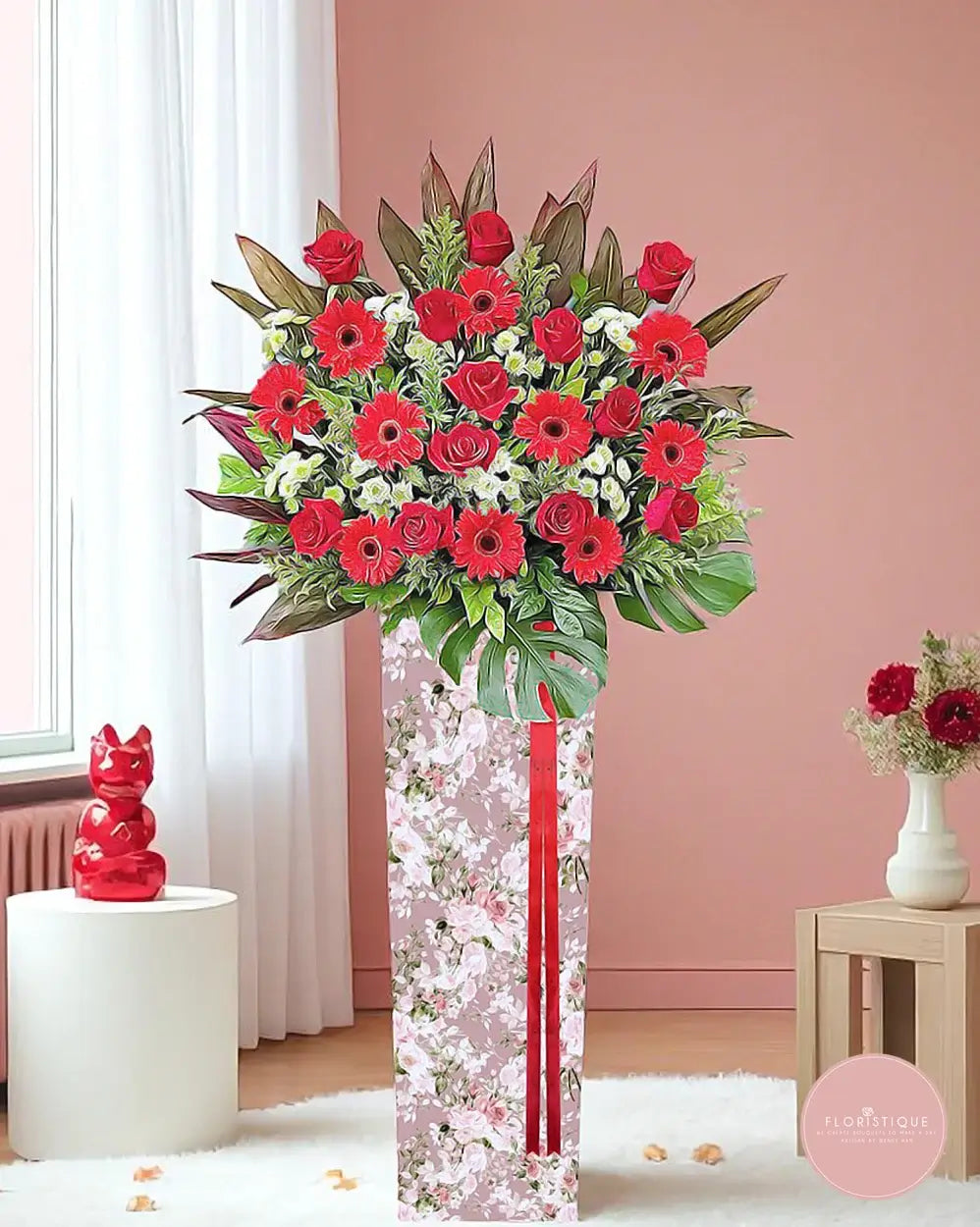 A commanding display of strength and celebration, this grand opening flower stand features classic red roses and bold red gerberas, elegantly paired with creamy eustomas and dramatic tropical foliage. Set in a floral-patterned stand with a luxurious red ribbon, it represents confidence, prosperity, and new beginnings.
