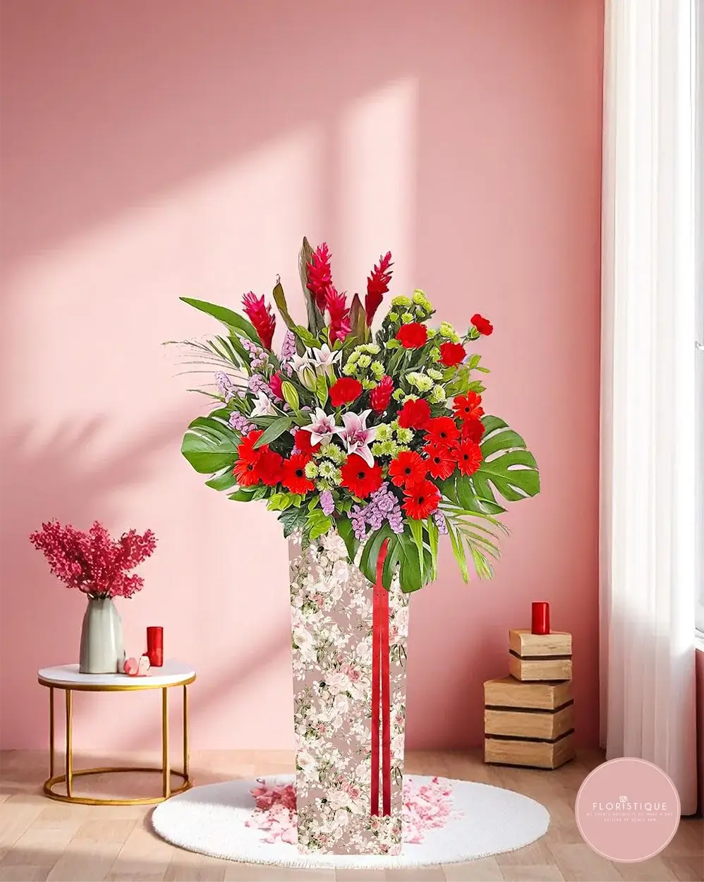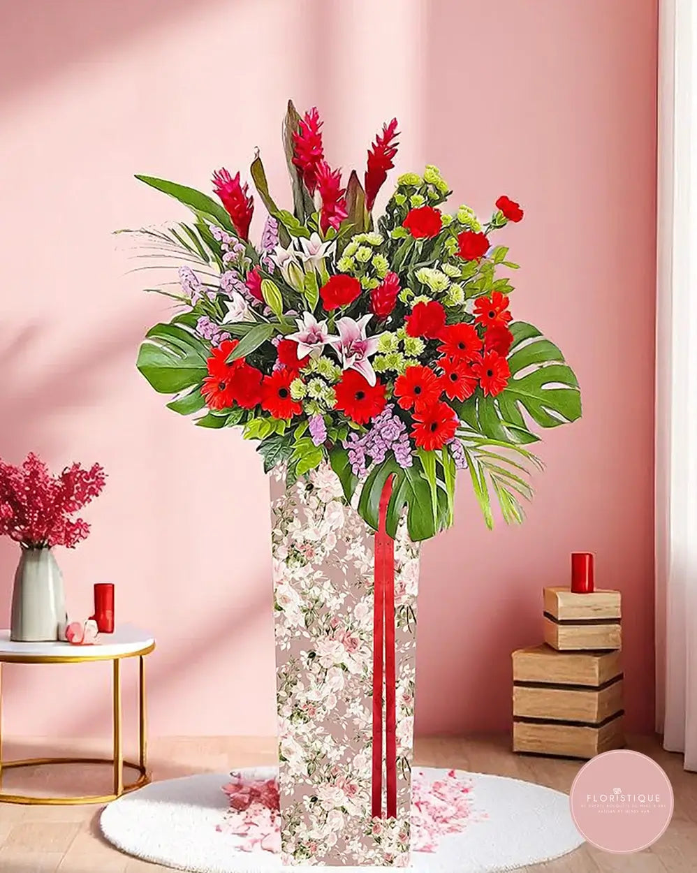 Celebrate new beginnings with this lively grand opening flower stand, brimming with red gerberas, roses, stargazer lilies, green pom-poms, and soft lavender fillers. Accented with fiery ginger blooms and tropical foliage, it’s beautifully arranged in a floral-patterned stand and finished with a rich red ribbon—exuding energy, joy, and success.