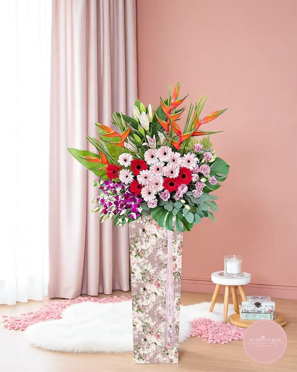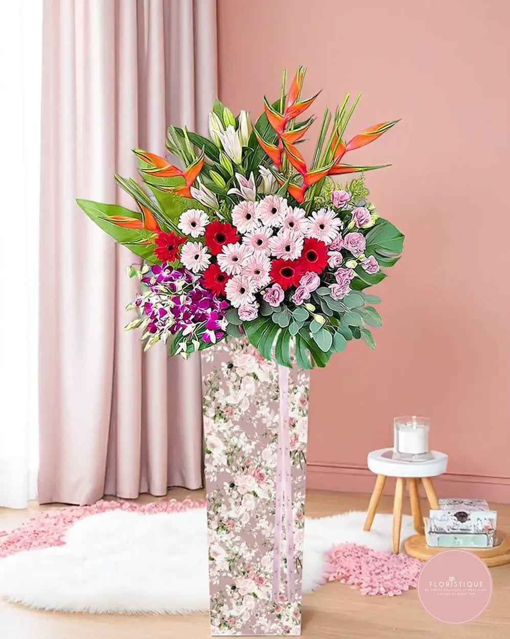 Bursting with colour and sophistication, this grand opening flower stand features a vibrant medley of pink gerberas, red roses, lilies, and purple orchids. Birds of paradise add a striking tropical flair, all beautifully arranged in a floral-patterned box with a soft pink ribbon—symbolising growth, joy, and success.