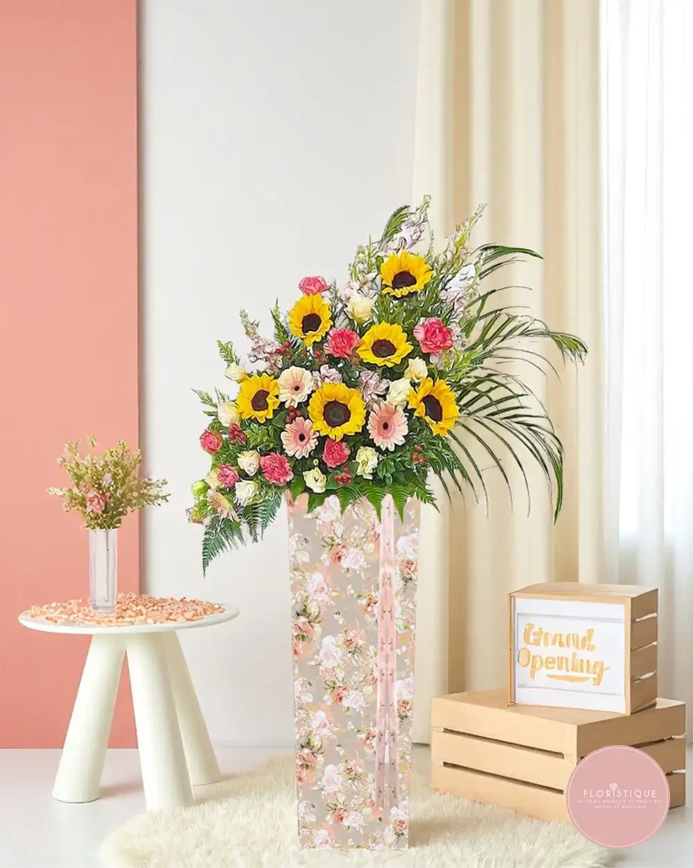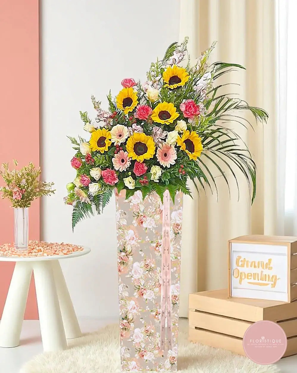 This cheerful grand opening stand bursts with the uplifting energy of sunflowers, blush gerberas, soft eustomas, and pink carnations. Accented with sweeping tropical greens and nestled in a floral-patterned box with a pale peach ribbon, it evokes hope, celebration, and bright new beginnings.
