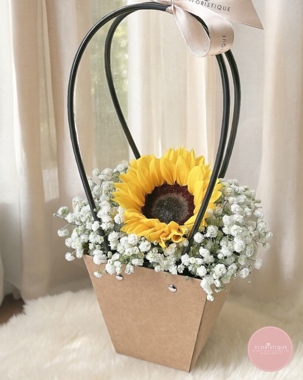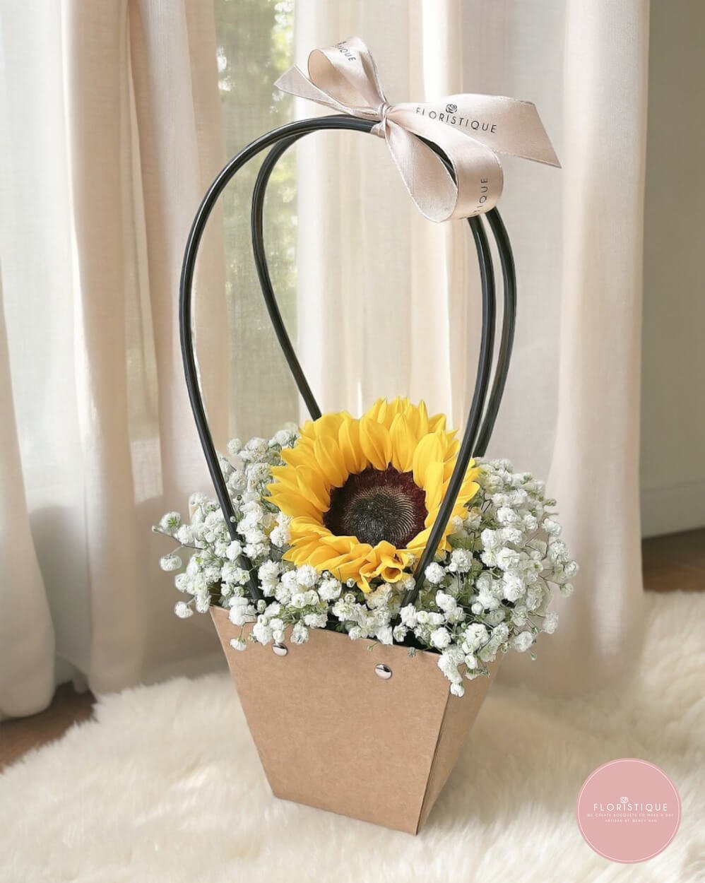 This delightful floral basket features a radiant sunflower nestled among a cloud of delicate white baby’s breath, creating a bright and uplifting arrangement that instantly brings warmth and joy. Presented in a rustic kraft basket with elegant black handles and finished with a soft ribbon, the design feels cheerful yet refined—perfect for birthdays, get-well wishes, congratulations, or simply to brighten someone’s day.