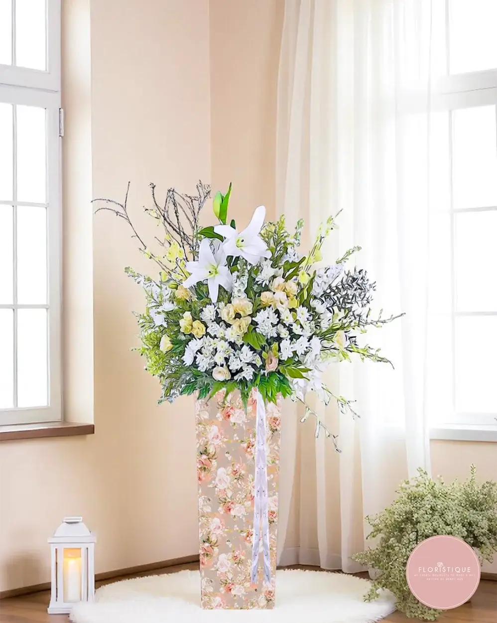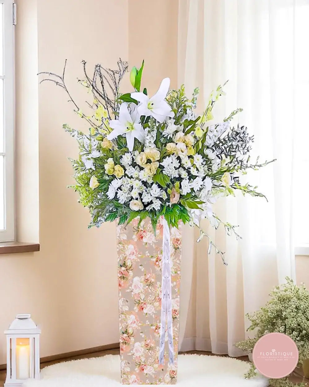 Convey heartfelt sympathy with this graceful condolence flower stand, featuring serene white lilies, soft champagne roses, and delicate matthiola blooms. Accented with seasonal foliage and presented in a soft floral-patterned base, this arrangement expresses comfort, remembrance, and support during times of loss.