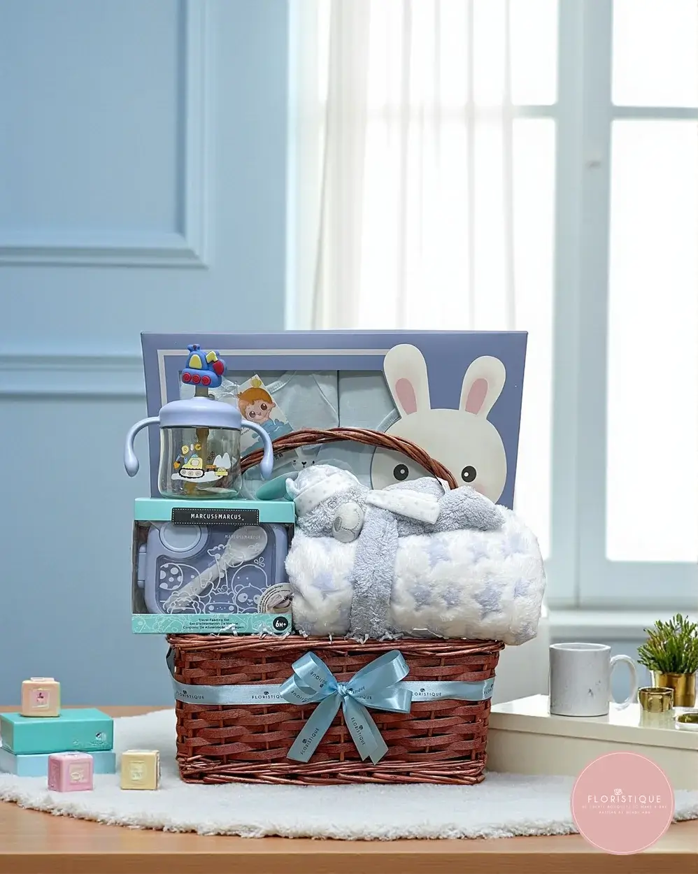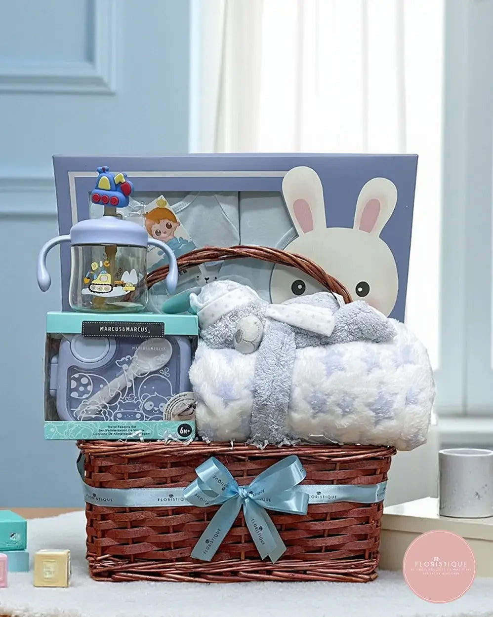 A thoughtfully curated baby hamper featuring a cozy baby blanket, an eco-friendly 5-piece dinnerware set, an adorable milk bottle, baby booties, and a handy feeding set — all beautifully presented in a classic woven basket with a satin ribbon. This charming mix of daily essentials makes it both practical and delightful for new parents.