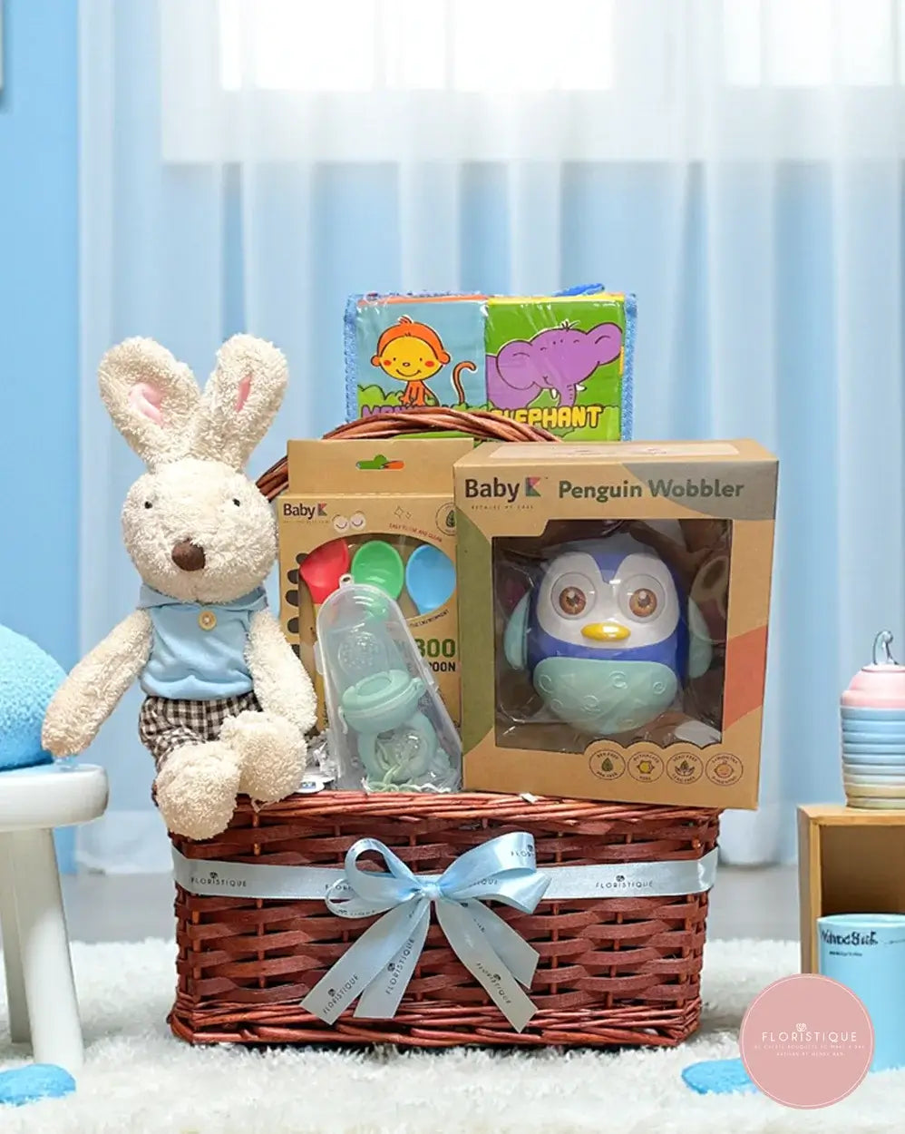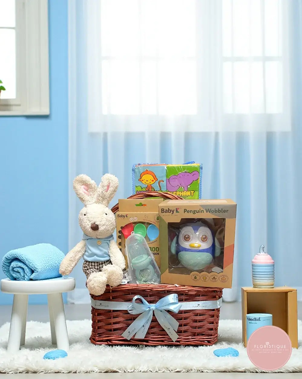 A charming hamper thoughtfully curated to welcome a precious baby boy. This brown wicker basket is filled with sweet essentials, including a cuddly bunny plush in a blue outfit, a soft baby bottle toy, a penguin wobbler, and an engaging baby cloth book. Tied with a light blue ribbon, it’s both a practical and heartwarming gift.