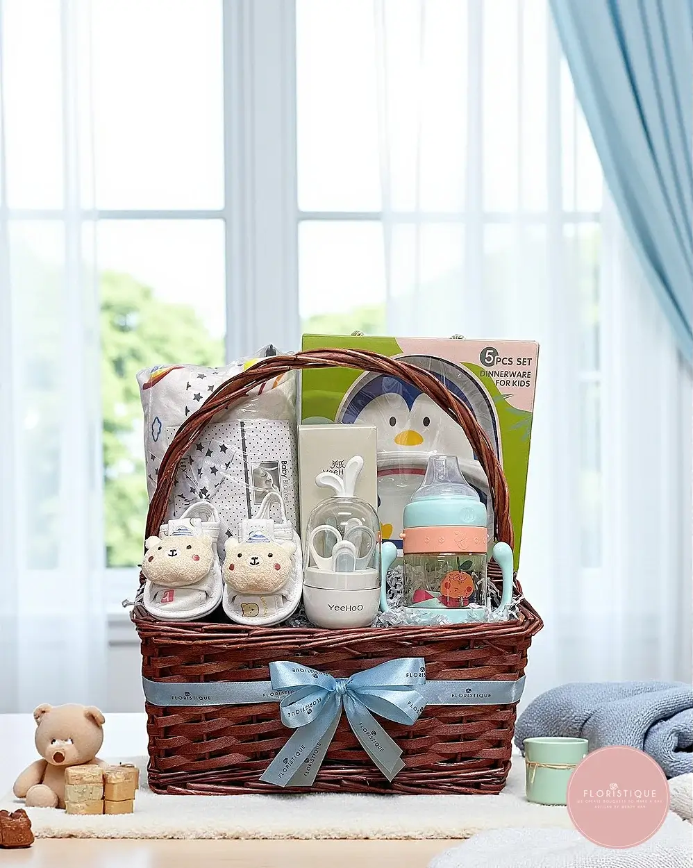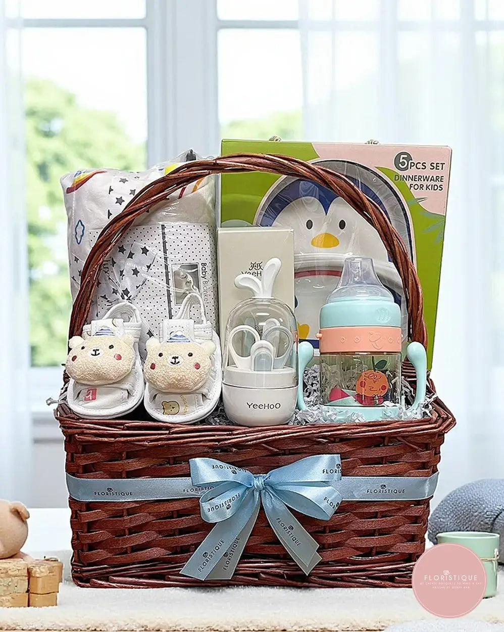 A thoughtfully curated baby hamper featuring a cozy baby blanket, an eco-friendly 5-piece dinnerware set, an adorable milk bottle, baby booties, and a handy feeding set — all beautifully presented in a classic woven basket with a satin ribbon. This charming mix of daily essentials makes it both practical and delightful for new parents.