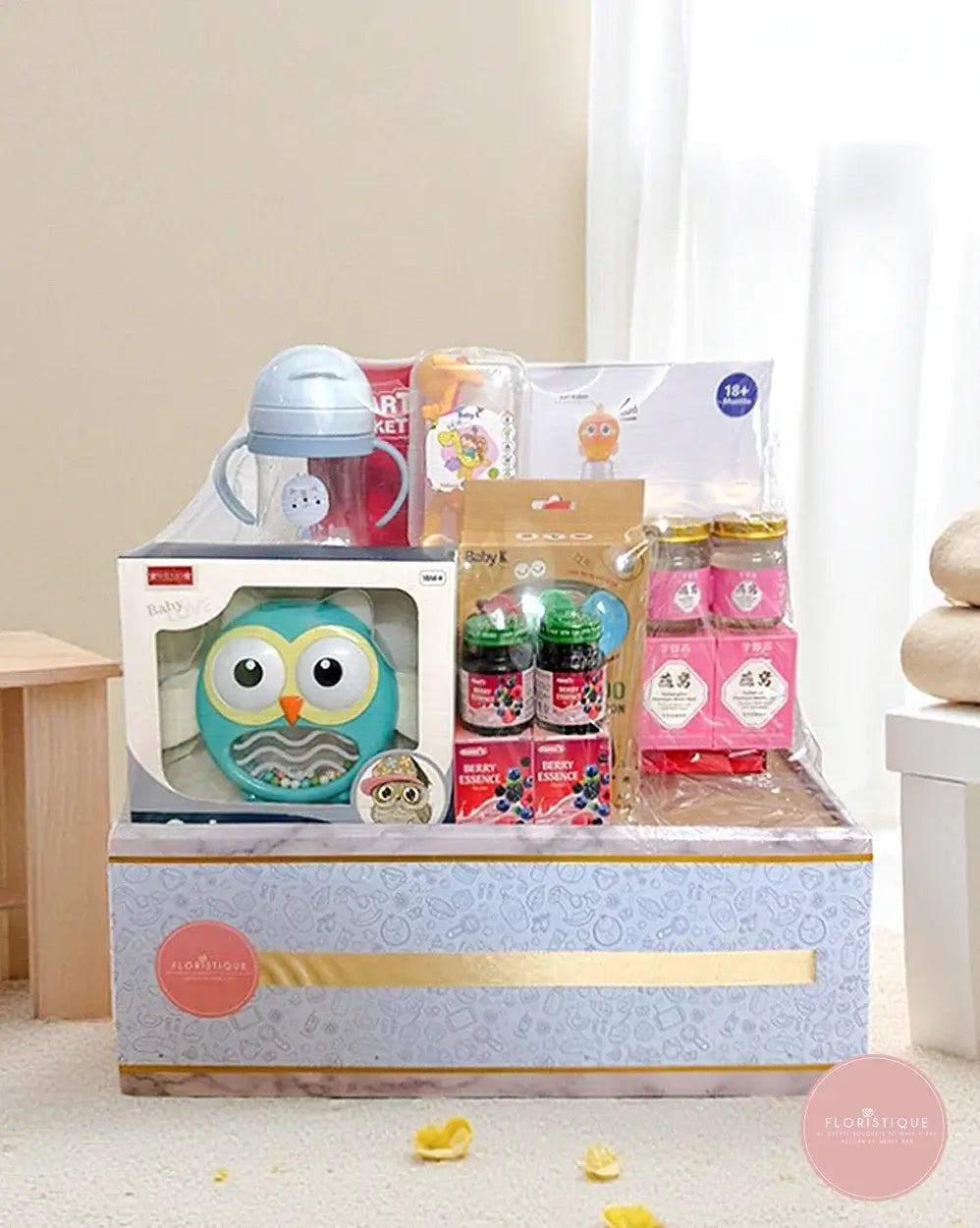 A luxurious gift set designed to pamper both baby and parents. This elegant blue gift box features a playful owl-shaped baby plate, a sippy cup, baby feeding utensils, and a fun penguin wobbler toy for the little one. For the parents, it includes nourishing bird’s nest drinks and essence of chicken, offering a boost of wellness and energy during the busy newborn days.