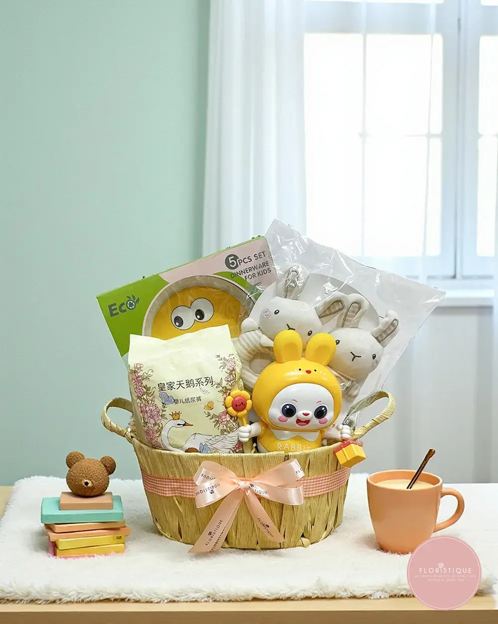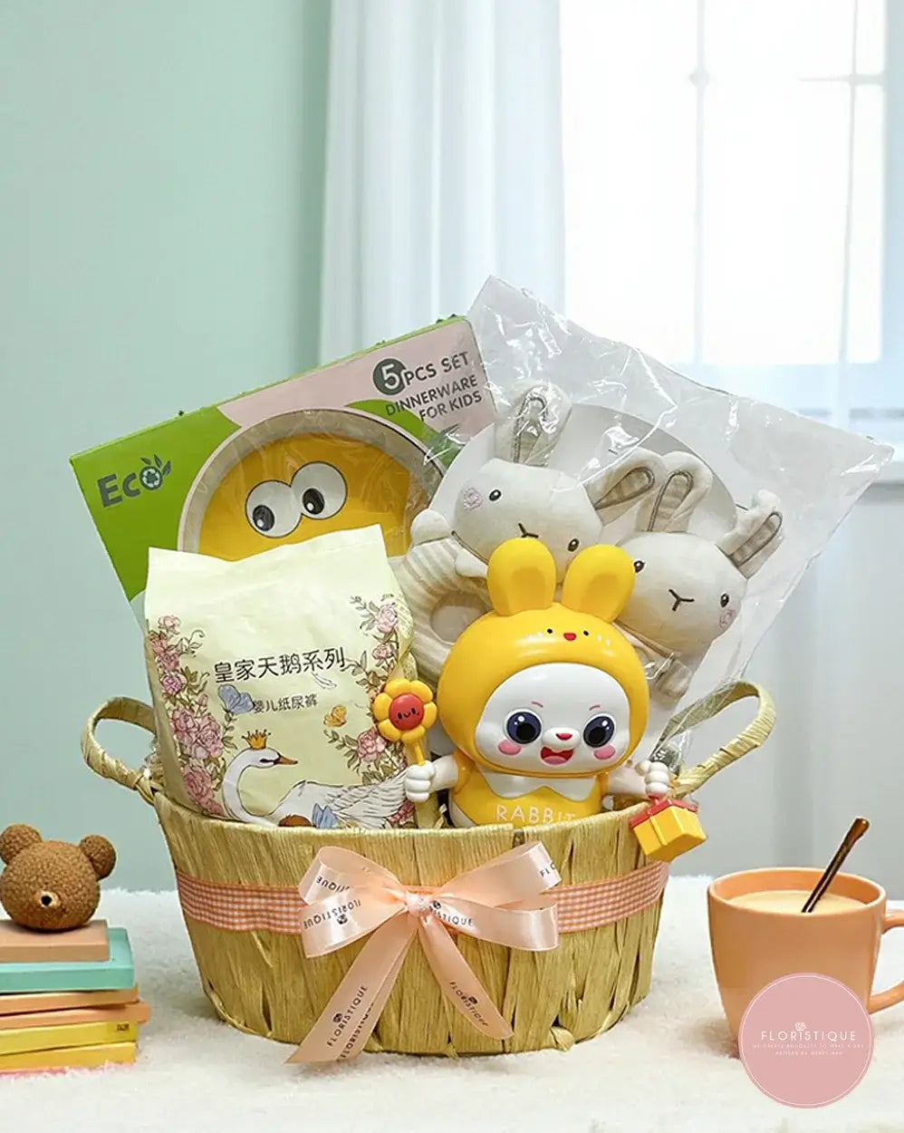 A sweet and thoughtful baby hamper filled with practical essentials and adorable keepsakes. This set includes a children’s 5-piece eco dinnerware set, soft plush bunny toys, baby-friendly diapers, and a cheerful bunny-themed toy to bring joy to both baby and parents. Beautifully presented in a woven basket and finished with a satin ribbon, it makes a charming and useful gift for new arrivals.