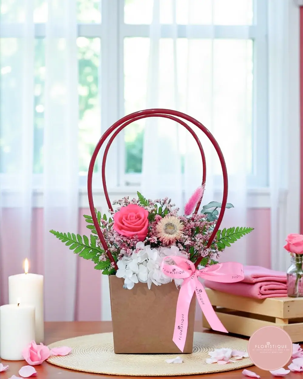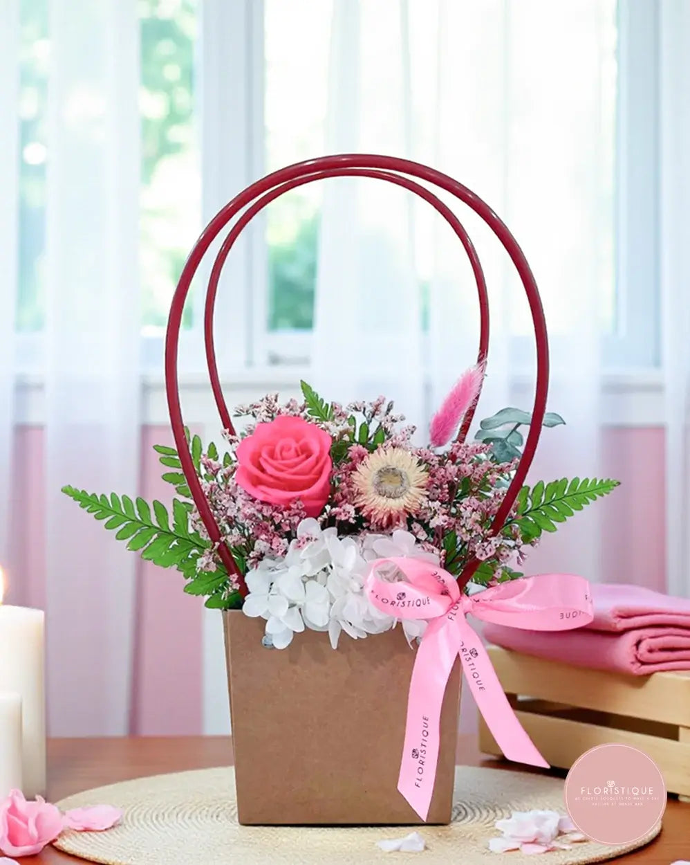 A charming preserved floral arrangement designed to last beautifully for months. Featuring a vibrant pink preserved rose complemented by white hydrangea, strawflowers, delicate pink fillers, and lush fern leaves, this piece is artfully arranged in a kraft bag with elegant red handles. A satin pink ribbon adds the perfect finishing touch for a sweet and stylish look.