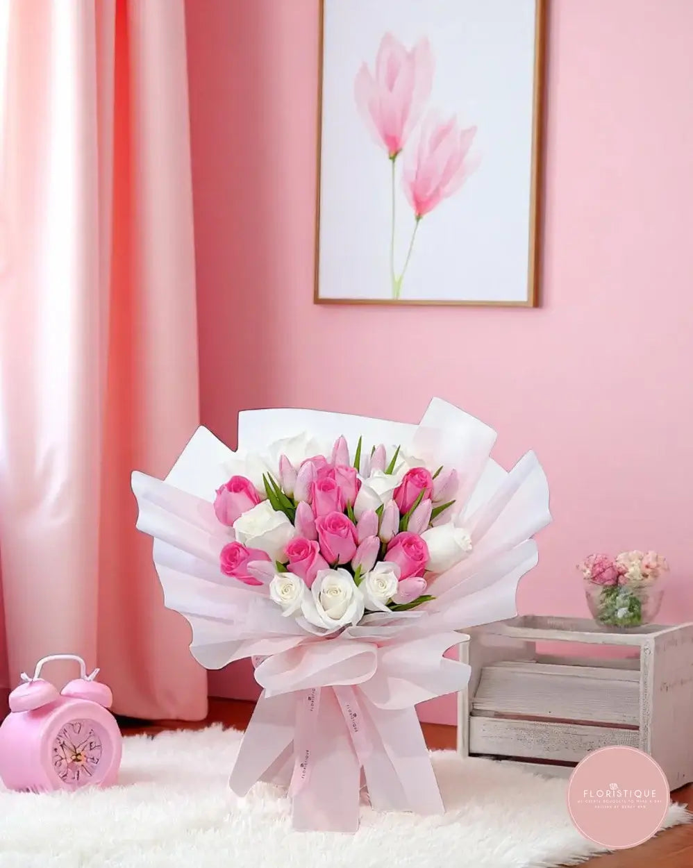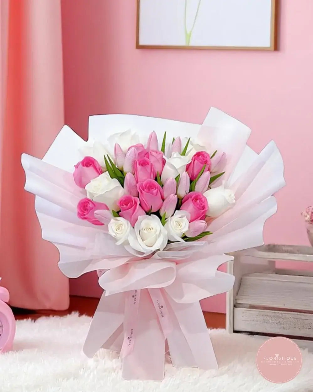 A radiant fusion of pink tulips, creamy white roses, and vibrant fuchsia roses, beautifully arranged and wrapped in soft pink layers. This charming bouquet captures the essence of elegance and affection — ideal for birthdays, proposals, anniversaries, or romantic gestures.