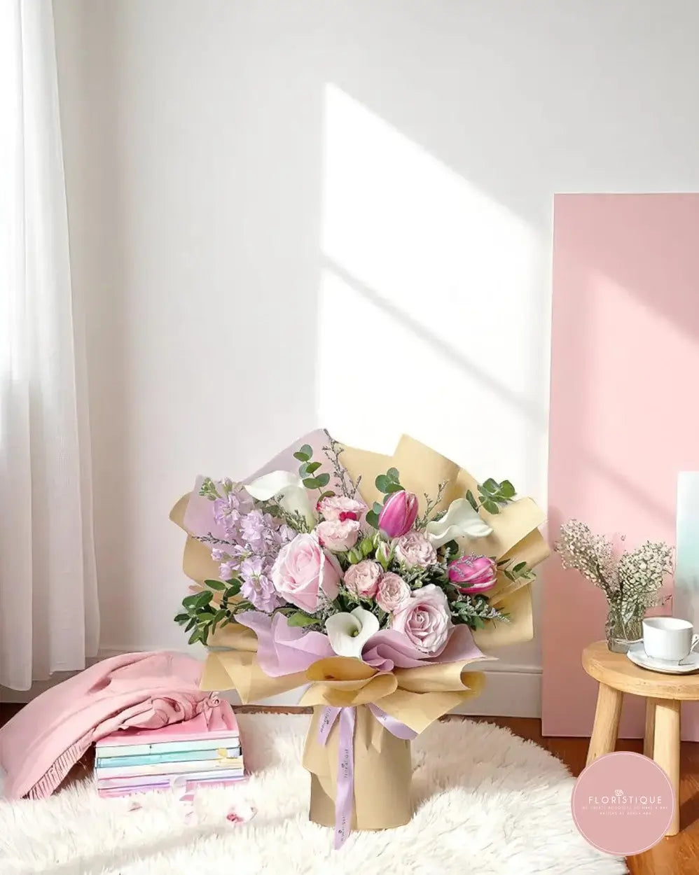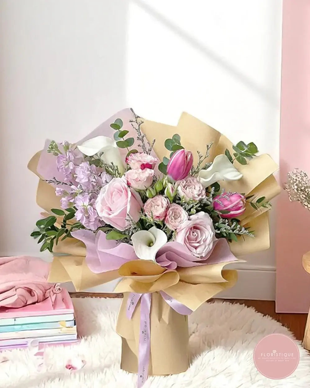 A graceful hand-tied arrangement featuring soft pink spray roses, delicate white calla lilies, and a single rosy tulip, beautifully complemented by fragrant lavender stock and silvery eucalyptus accents. Each bloom is carefully chosen for its lasting freshness and elegant silhouette, then wrapped in natural kraft and pastel lilac paper with a flowing ribbon—creating a look of timeless sophistication and gentle romance.