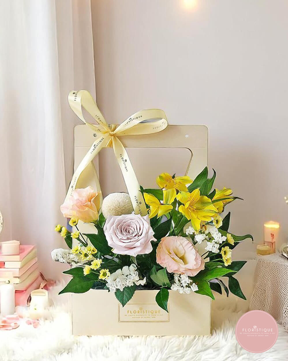 Radiating cheerful warmth, this sunny arrangement features a lively mix of yellow lilies, soft champagne roses, pale pink eustoma, and fluffy chrysanthemums. Thoughtfully presented in a pastel cream bloom bag and adorned with a soft yellow ribbon, this design brings brightness and optimism to any space.