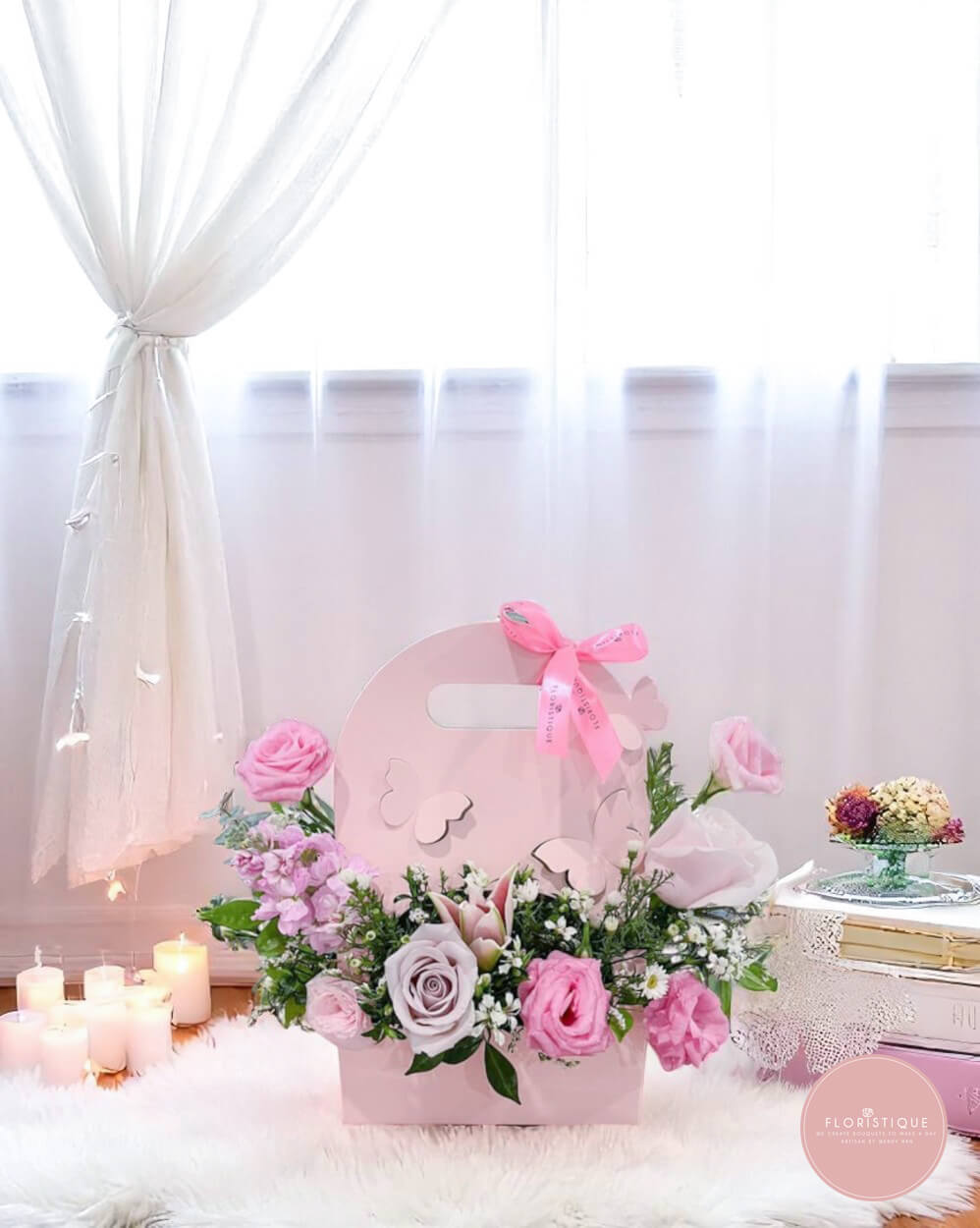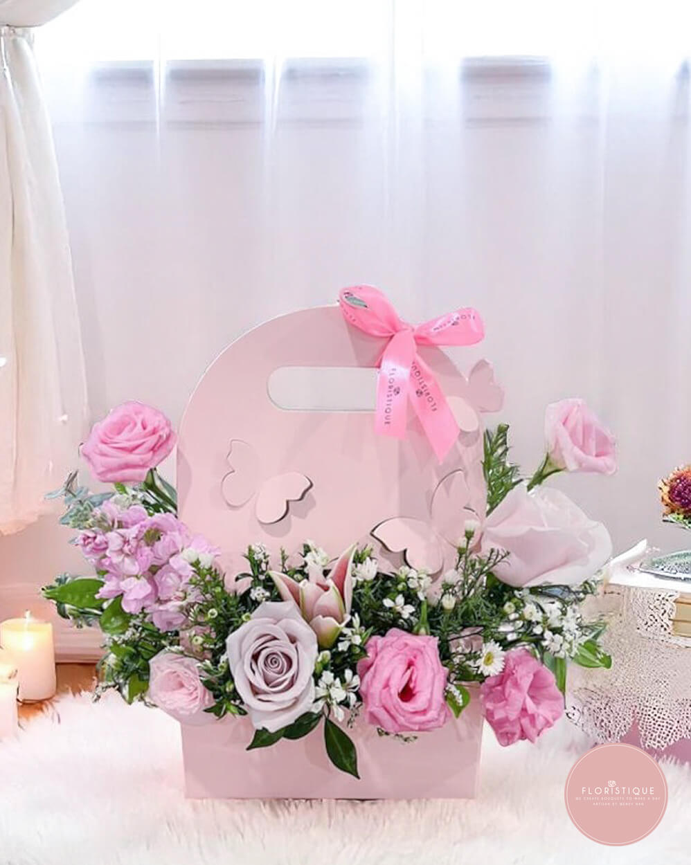 Gracefully arranged in a pastel pink floral carrier, this delightful bloom bag features a medley of pink rose, lily and eustomas. Accented with soft greenery and butterfly cutouts, it brings a charming, whimsical touch to your heartfelt gift.