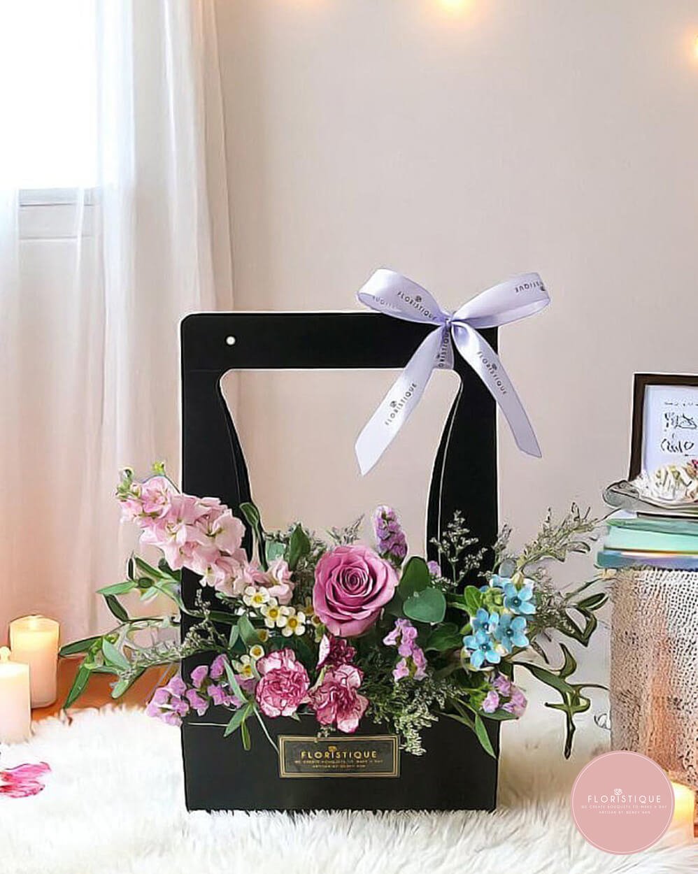 A captivating medley of cool-toned elegance, this arrangement features lavender roses, soft mauve blooms, and whimsical touches of blue and pink. Set in a sleek black bloom bag and finished with a lavender satin ribbon, it’s a perfect balance of mystery, grace, and charm.