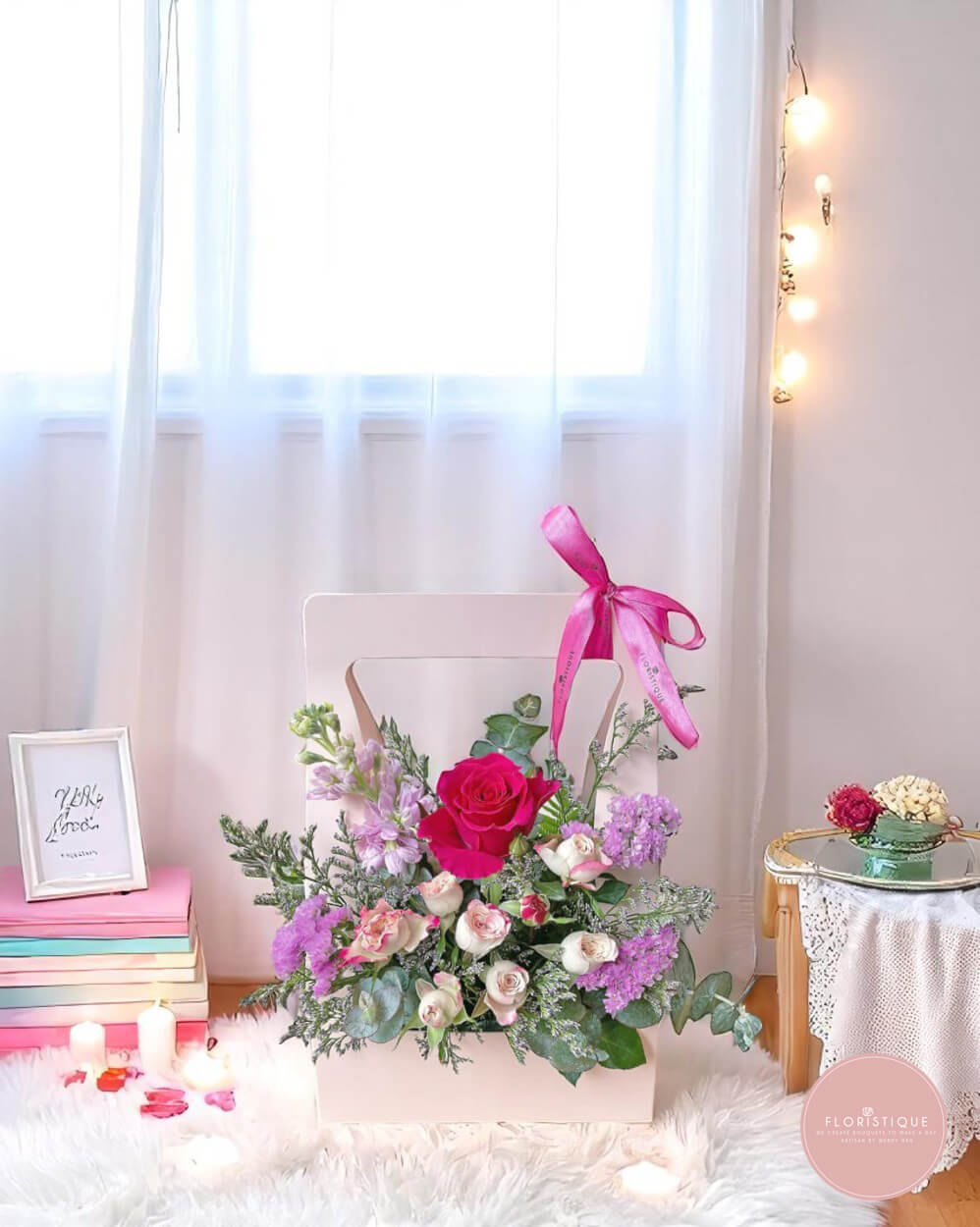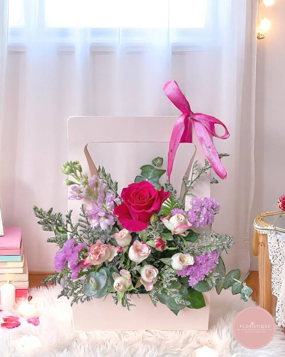 A graceful celebration of charm and sweetness, this floral arrangement features a captivating hot pink rose surrounded by lilac asters, pale pink spray roses, and dainty filler blooms. Thoughtfully presented in a blush-toned bag and finished with a flowing pink ribbon, this design radiates joy and femininity.