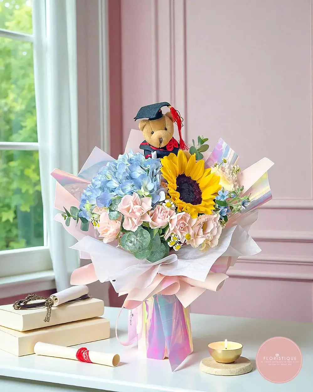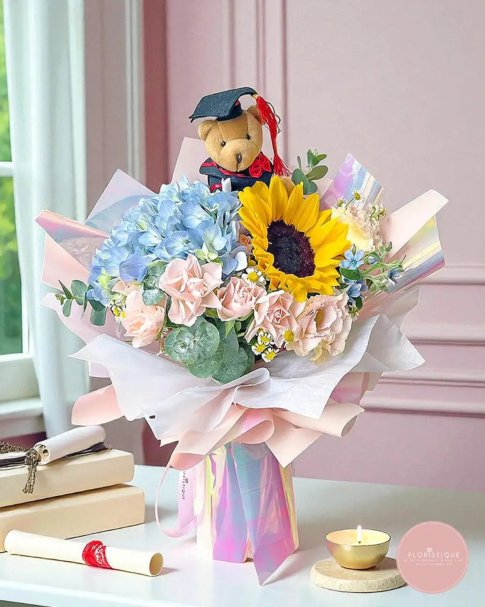 Bursting with joy and color, this bouquet features a radiant sunflower paired with pastel hydrangeas, soft roses, and lush greenery. Topped with a charming graduation teddy bear, it’s the perfect gift to celebrate academic success and show your pride in their milestone.