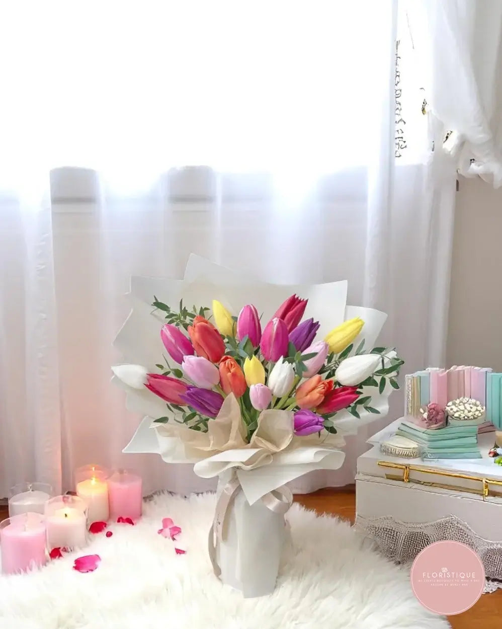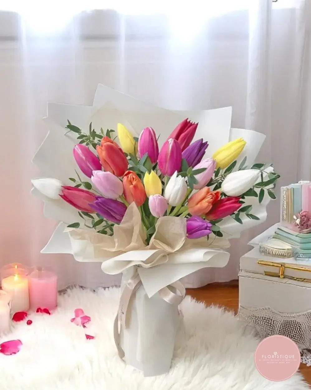 Introducing our Vibrant Tulip Bouquet — a stunning arrangement featuring a symphony of colorful tulips in shades of pink, purple, yellow, red, and white. Each tulip is carefully selected and artfully arranged to create a bouquet that radiates joy and elegance. Wrapped in premium paper, this bouquet is perfect for any occasion, bringing a touch of springtime freshness to your special moments.