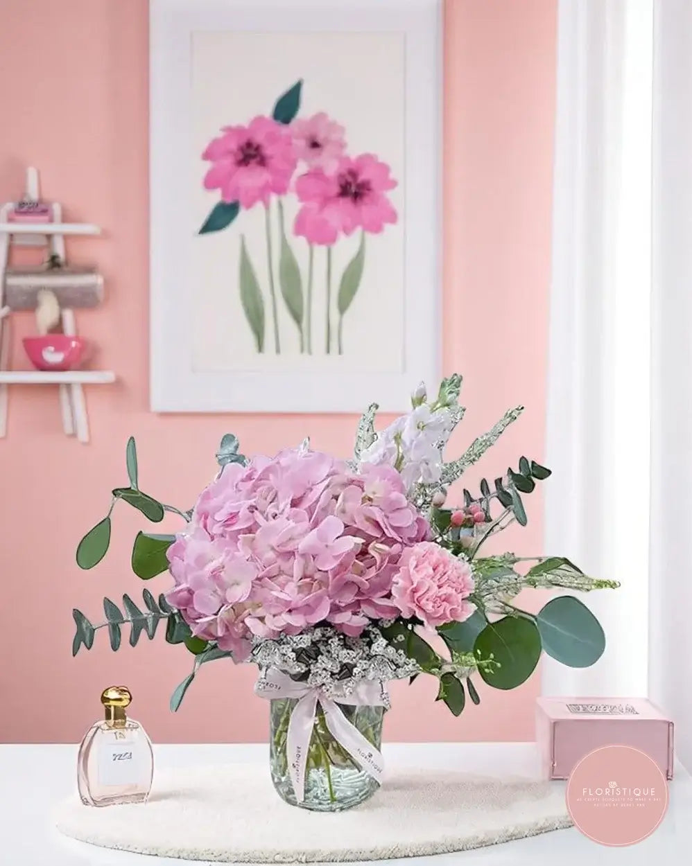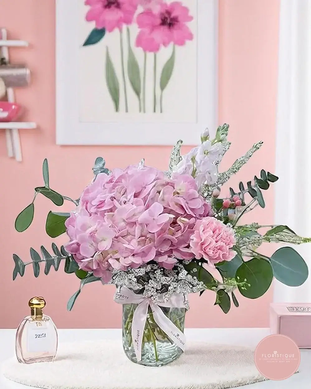 This delightful vase arrangement features a blend of cheerful pink hydrangeas, soft carnation, pale larkspur, and dainty fillers, accented with fresh eucalyptus for a refreshing finish. Neatly arranged in a clear glass jar and tied with a satin ribbon, it's a charming gift for any celebration or table display.
