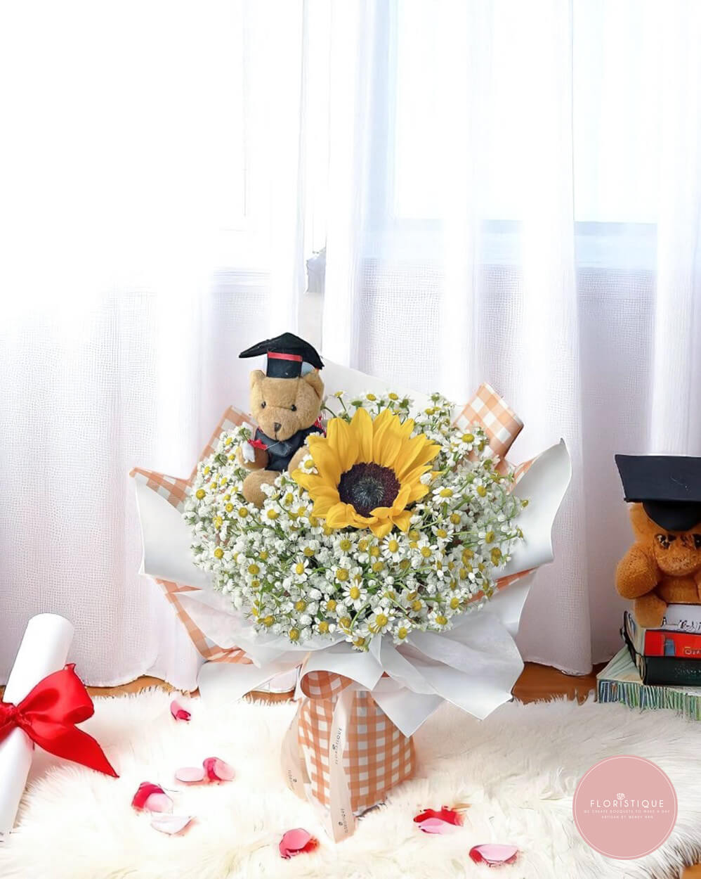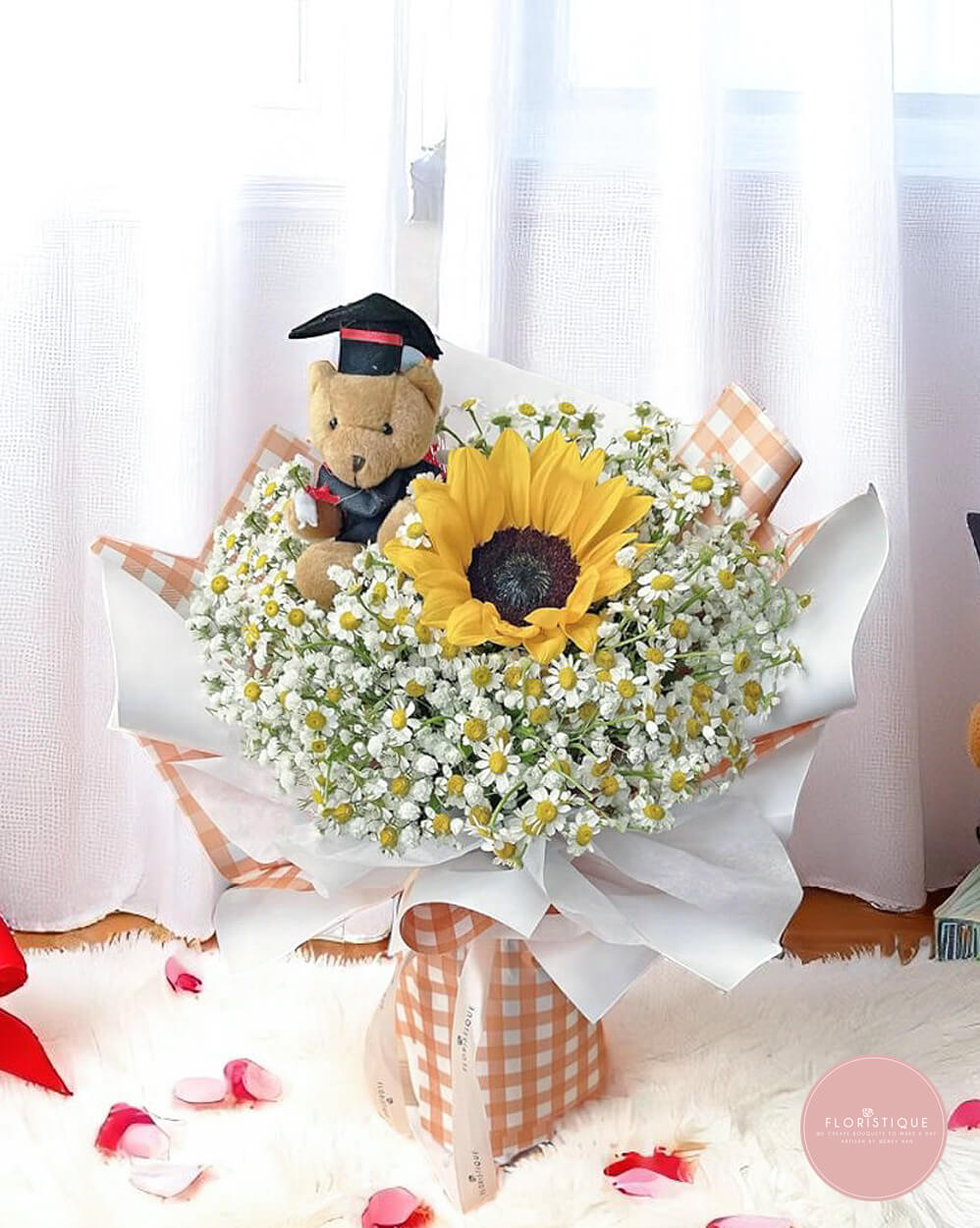 Bright and uplifting, this bouquet features a radiant sunflower surrounded by delicate chamomile blooms and finished with a playful graduation teddy bear. A joyful gift that symbolizes success, happiness, and new beginnings, it’s perfect for celebrating academic milestones in style.