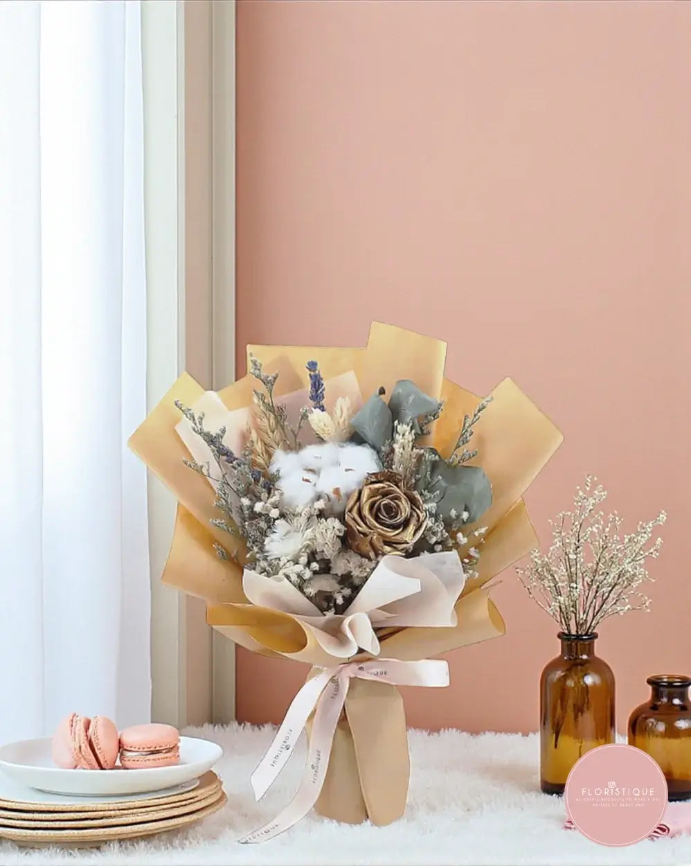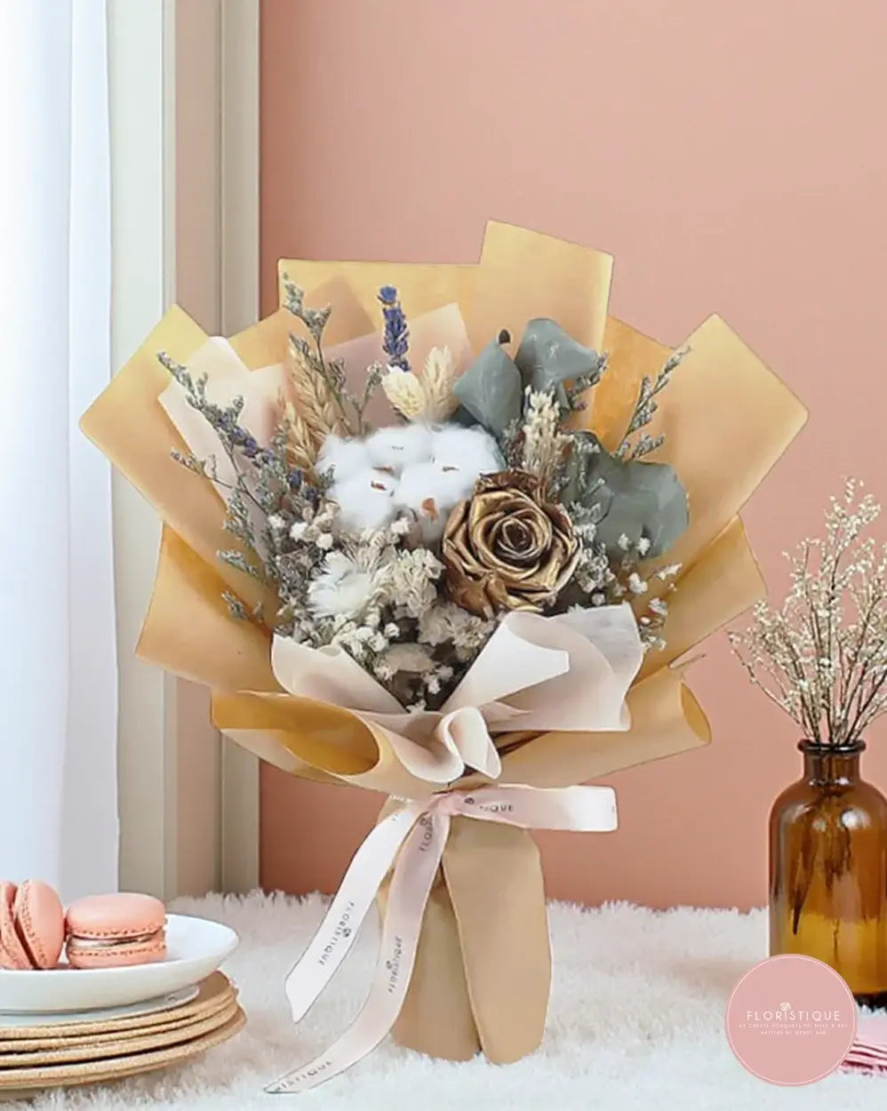 A symbol of timeless elegance, the Golden Whisper bouquet features a striking preserved gold rose paired with fluffy cotton blooms, dried lavender, eucalyptus, and an array of ivory-toned preserved florals. Wrapped in luxurious kraft and cream-toned paper and finished with a soft satin ribbon, this arrangement makes a chic and lasting impression.